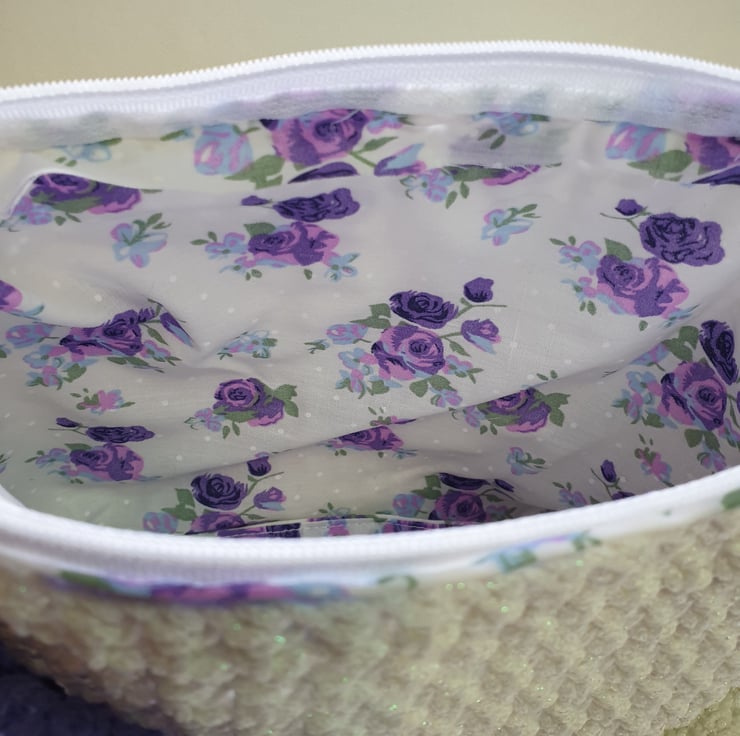 This bag has been fully lined with a pretty purple floral cotton fabric and comes with a zip.