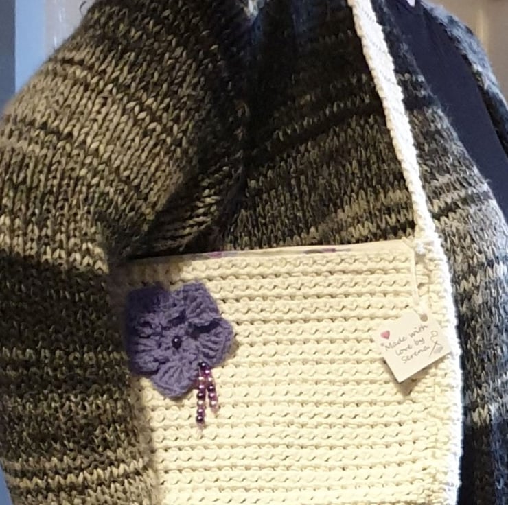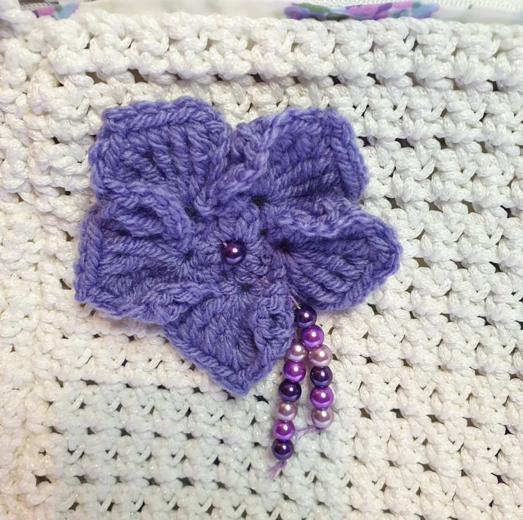 A small purple crocheted flower with purple beads has been added to the front for decoration.
