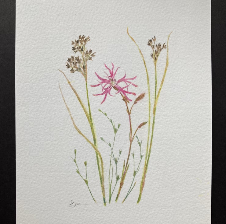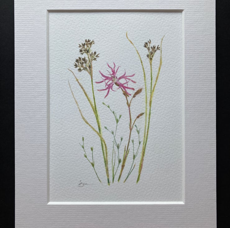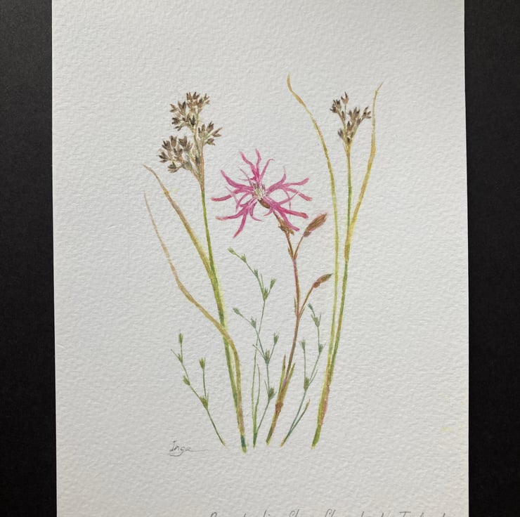 This is my original watercolour painting of ‘Ragged robin, Sharp-flowered rush and Toad rush’. It is a ‘one-of-a-kind’, unique item and is signed by me. It has been painted using quality paints onto an A5 cold pressed watercolour paper.