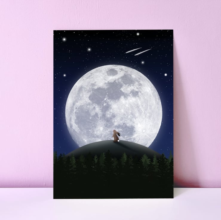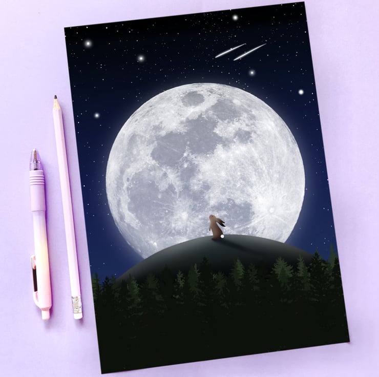 This beautiful print of a hare gazing at the full moon has been designed, drawn and printed by me in my little studio in Staffordshire. The print depicts a hare sitting on a hillside and gazing lovingly at the full moon and making big wishes.
