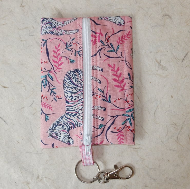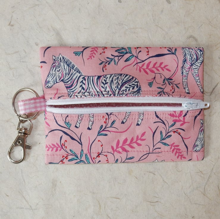 Sometimes you need a little purse to attach to your keys or belt clips, just to carry the essentials. This zebra themed purse is made from cotton print fabric with zebras on a pink background, which has been quilted to enhance the effect. It measures approx. 5 x 3.5 inches (13 x 9 cm) and it is lined in pink and white floral fabric with a central zip and clip attachment.