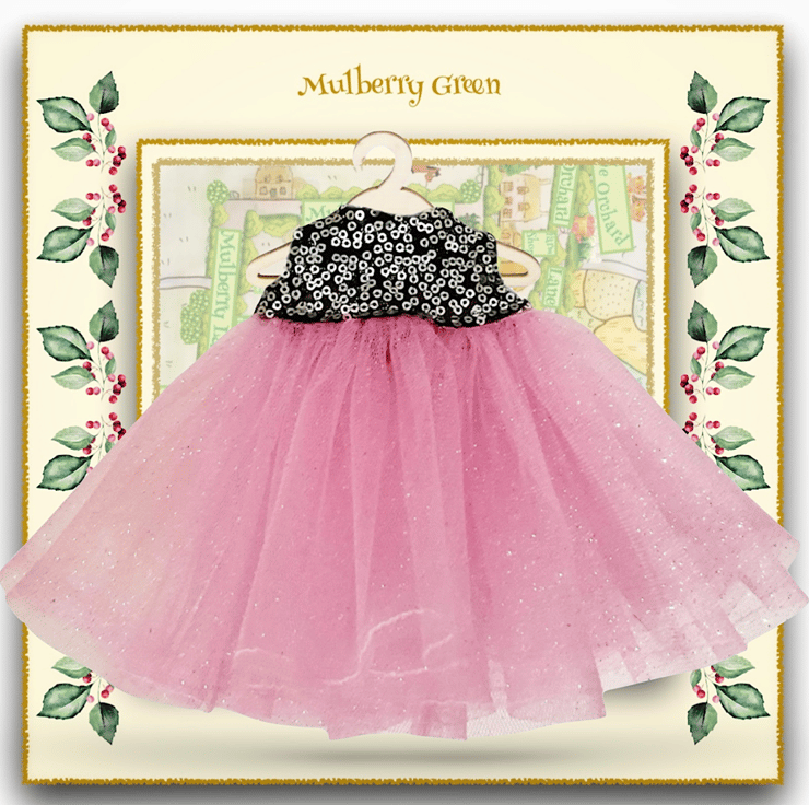 A beautiful little sequinned dress with a glittery pink net skirt to fit the Mulberry Green characters. The dress has a lined bodice.