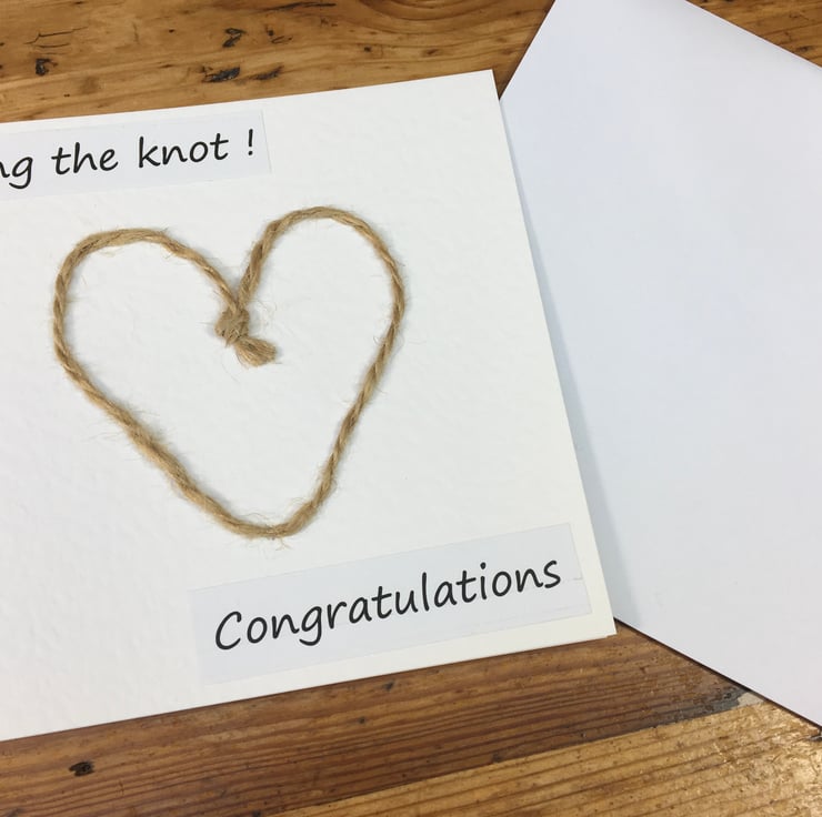 Celebrate the joy of two hearts becoming one with this handmade ‘Tying the Knot' wedding or engagement card. A knotted natural string heart is hand stitched on the card. A beautiful symbol of love and commitment. Send your heartfelt congratulations with this one-of-a-kind, handcrafted creation.