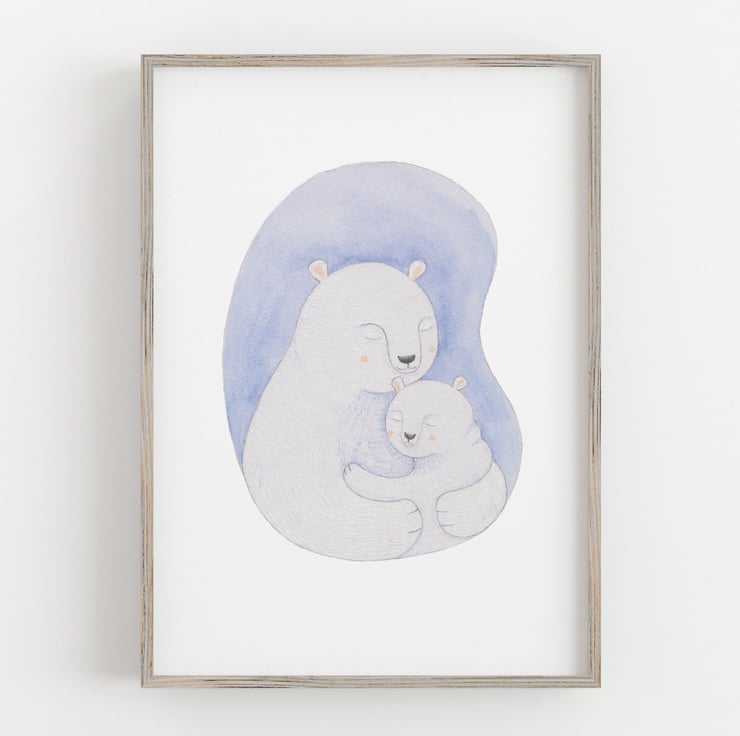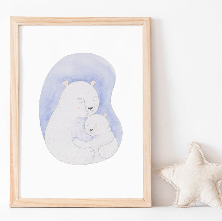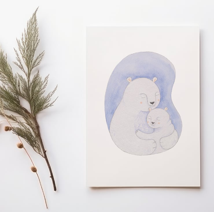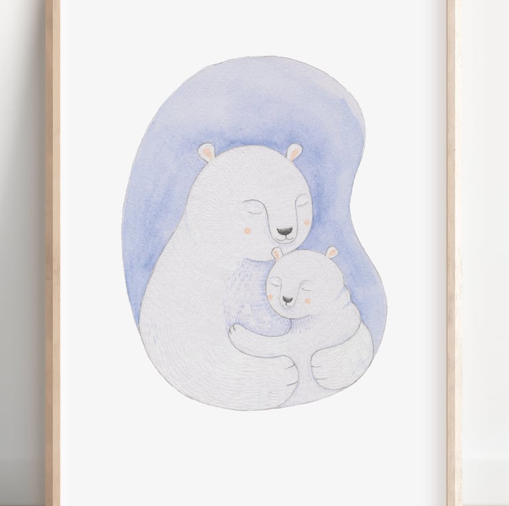 I’ve hand drawn these two bears using coloured pencils and watercolour. I’ve then carefully scanned them into my computer before making some final adjustments and then professionally printing for a high-quality finish.