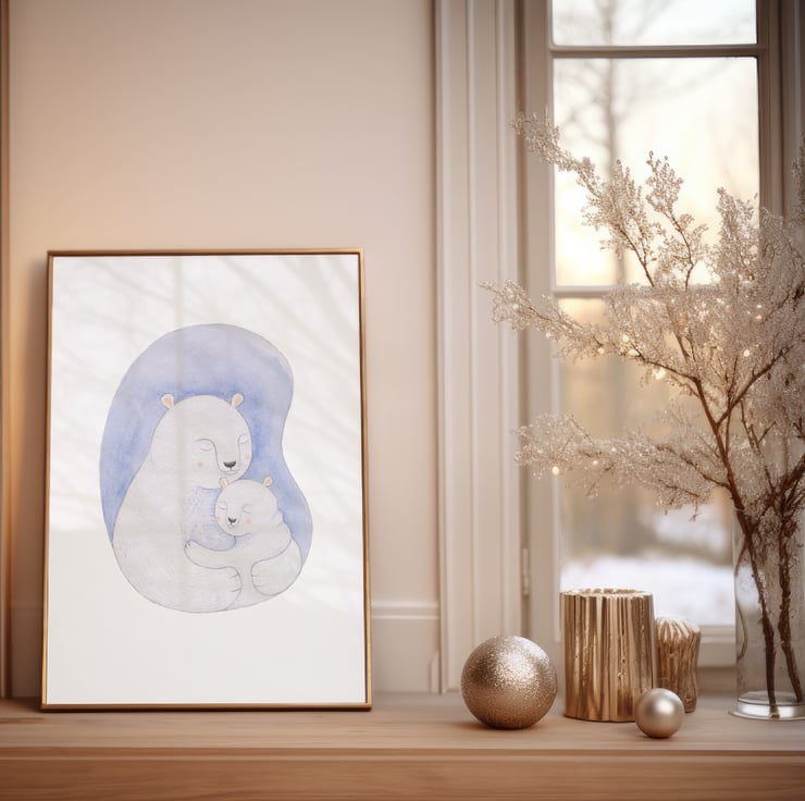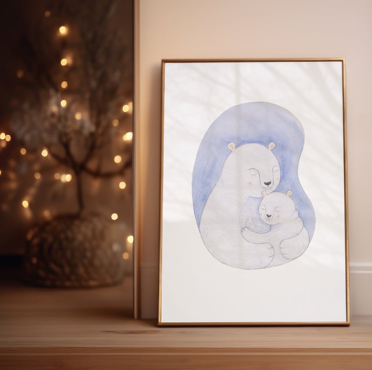 Two cute polar bears share a special cuddle in this illustration. This would make a wonderful gift for a baby’s first Christmas and would look so sweet hung on their nursery or bedroom wall.