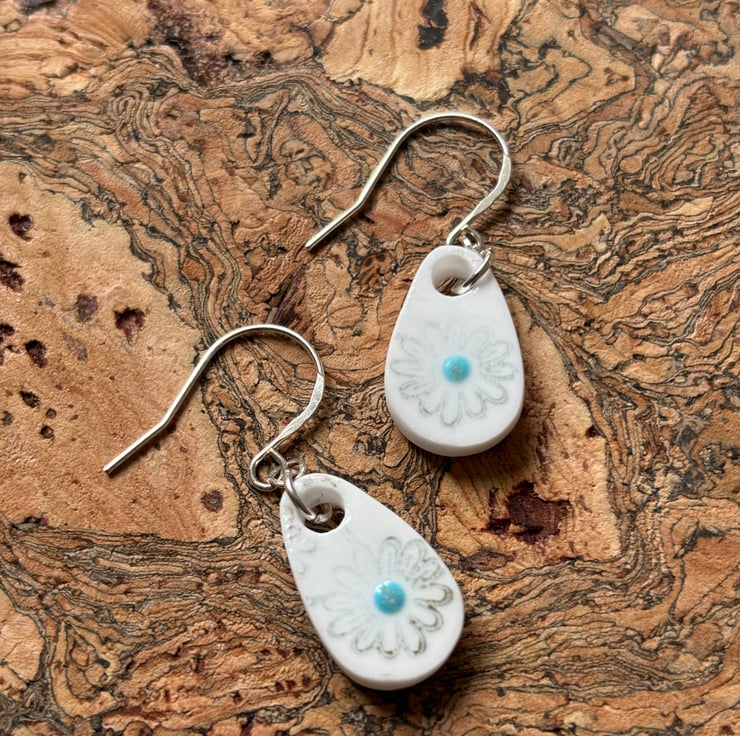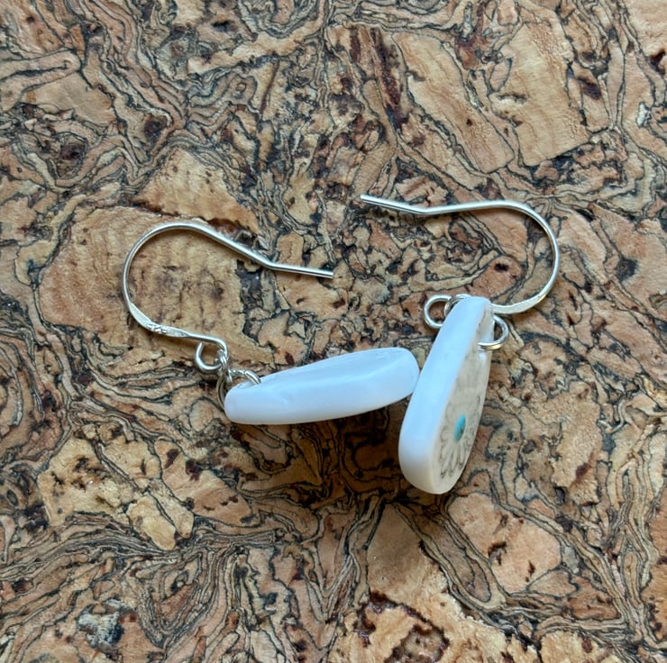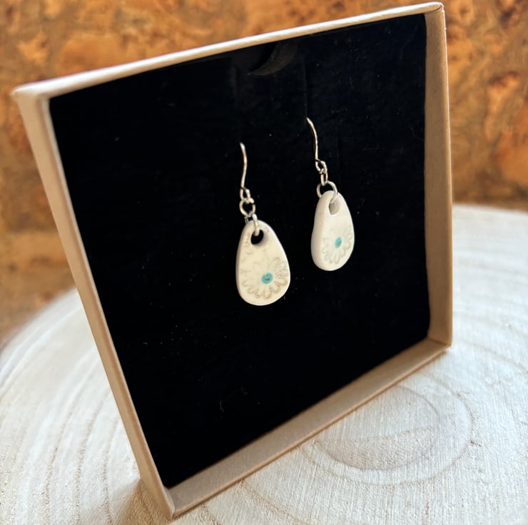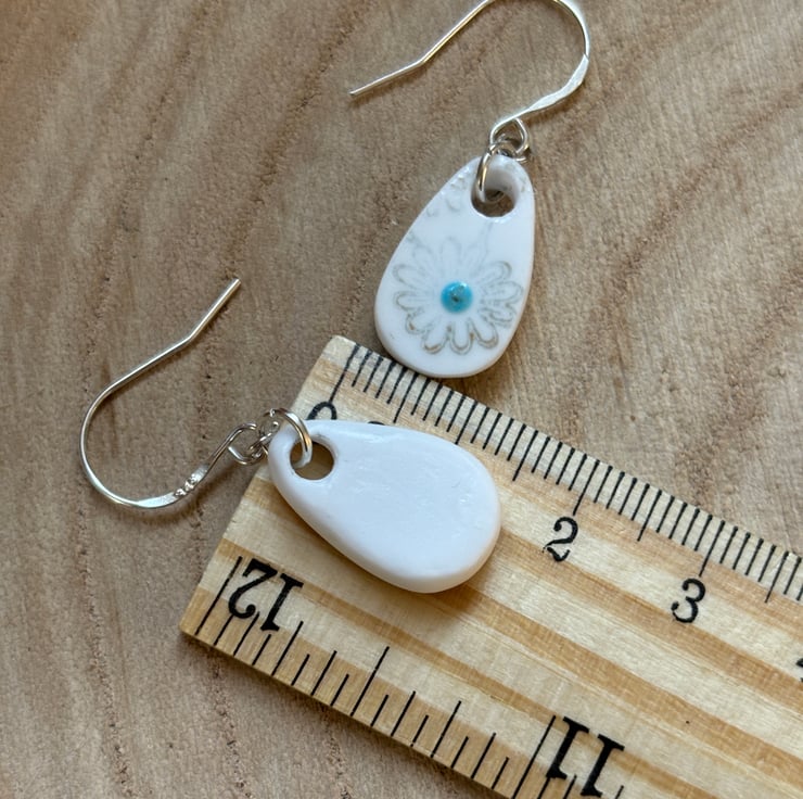 These earrings are made from the lower part of the rim. Although some of the gold has disappeared what is left still catches the light. Front glaze in tact, back sanded and sealed with eco friendly matt sealant. Neat, compact size with simple fish hooks.