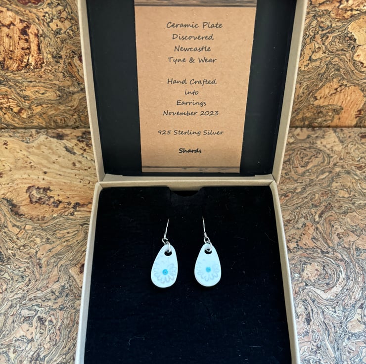 Hand crafted Jewellery and framed artworks using pre loved and discarded ceramics. Ceramic material will show signs of wear and damage. Entire process is a creative experience from discovery to final picture, nothing planned or preconceived. All materials personally collected from river banks, charity shops, roadside, woods, recycle centres, beaches, wherever dropped, dumped or donated ceramics are found, cleaned and shaped into new stories. Each piece comes with a short bio of where the ceramic came from, date found and re-created. Some shards collected are used as found, others are cut randomly which shape the final work. Every piece is individual, nothing replicated, however, due to repetitive patterns in ceramics there will be some similarity but only through the ceramic material not in the final piece.