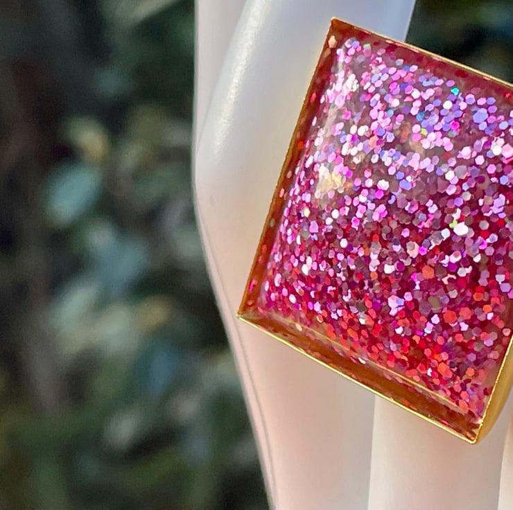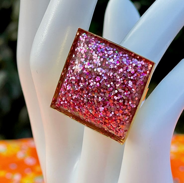 I've used a gold plated ring base and a poured pink glitter cabochon in a fantastic 25 mm square size. I'll have it laarge please.