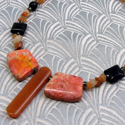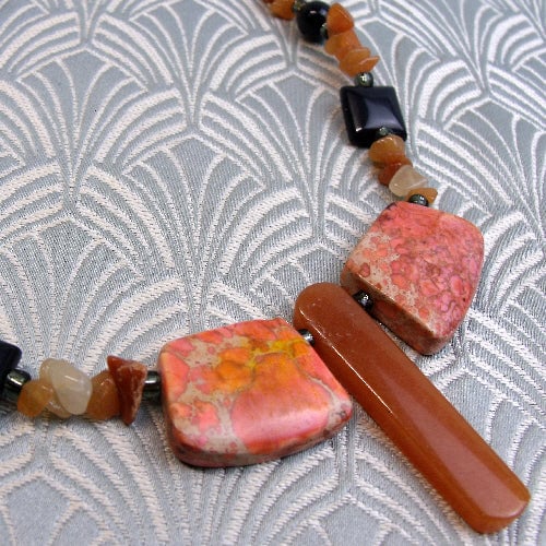 The necklace continues with nuggets of orange red aventurine and I have set black onyx beads among these.