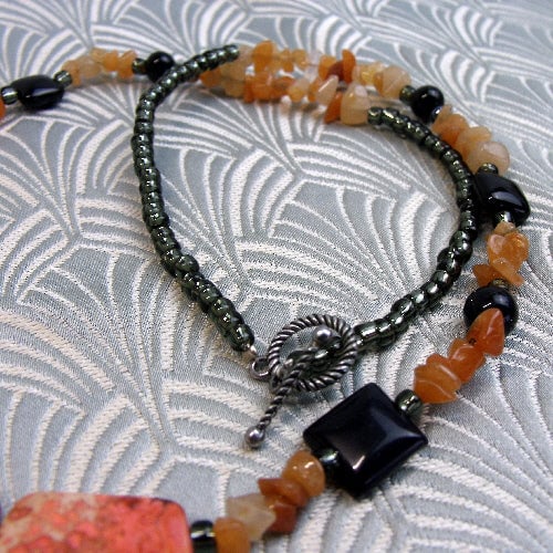 This orange jasper necklace finishes with small black glass beads and fastens with a toggle clasp