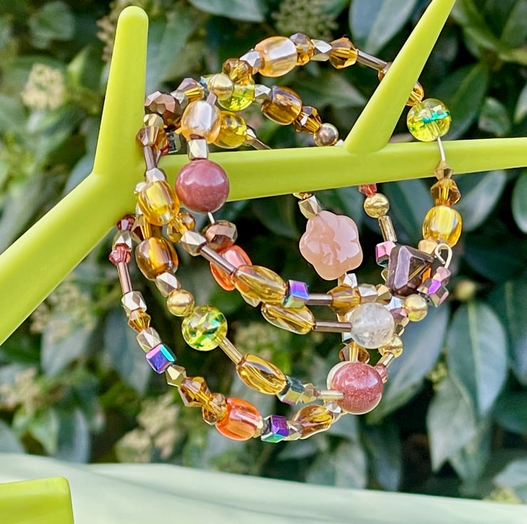 I've used gold memory wire and beaded crystals and Czech glass and gold beads, flowers to create a stunning piece of jewellery.