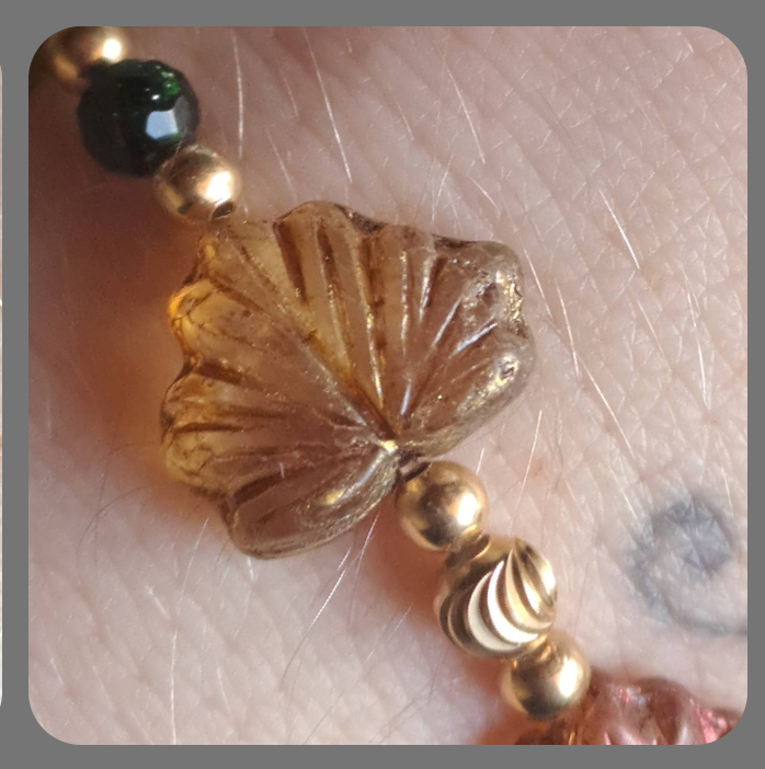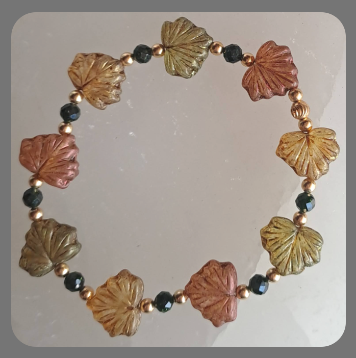 Pretty bracelet made with Czech glass Maple Leaves, Green Goldstone and vermeil (gold plated sterling silver).