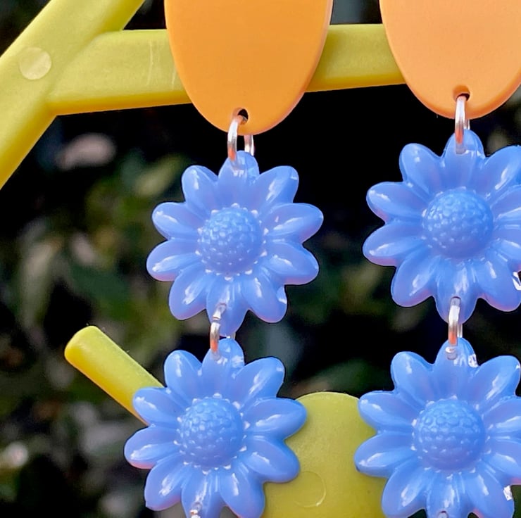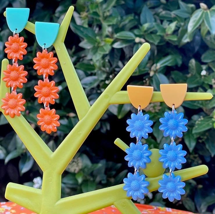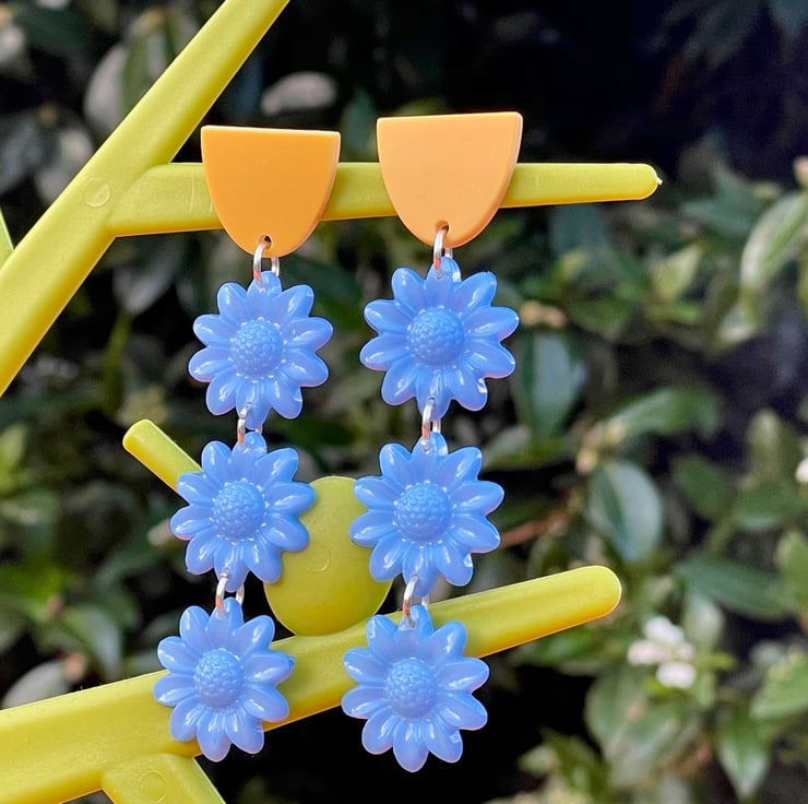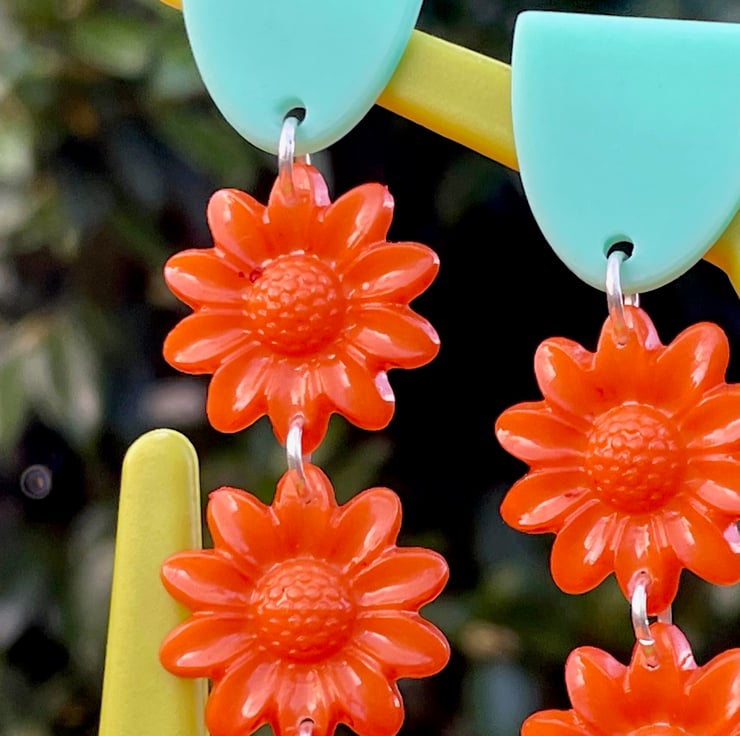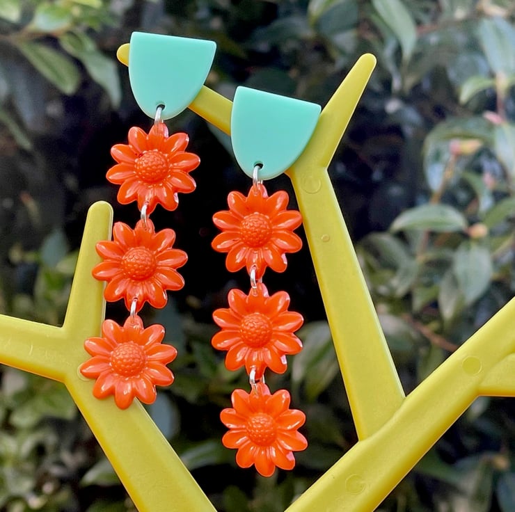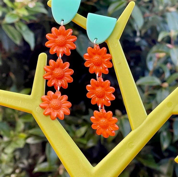We are madly in love with these beautiful resin three flower earrings in the sweetest of retro colours. I've used gorgeous flower flatback resin pieces in beautiful orange and blue and paired them with stunning resin pushback posts in complimentary colours of turquoise and mustard. All secured with stainless steel jump rings.