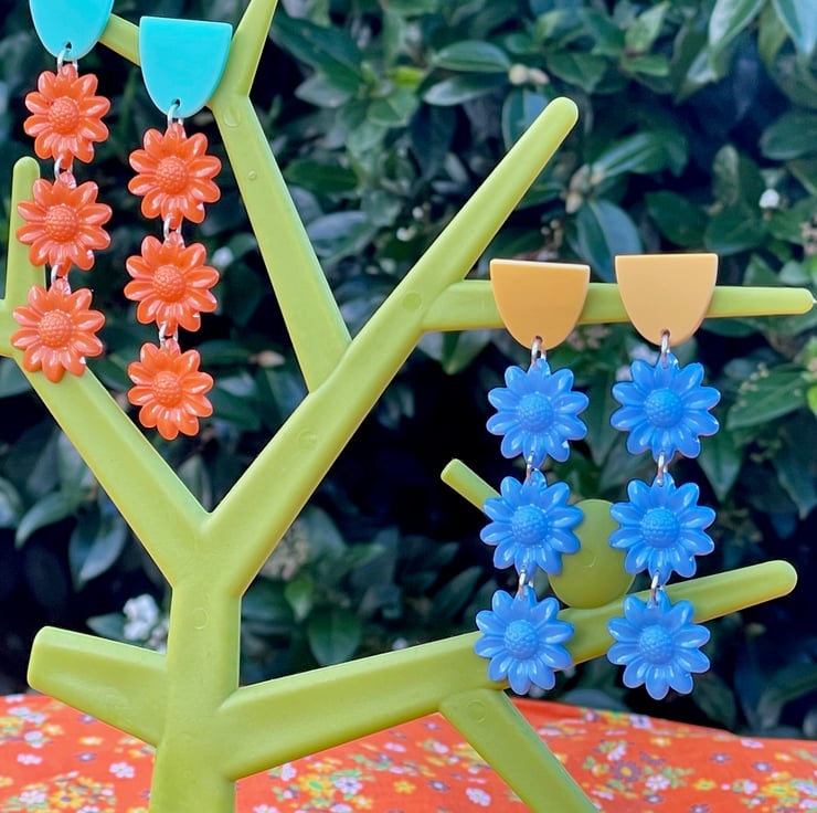 RESIN FLOWER EARRINGS retro colours orange blue mustard turquoise kawaii pushbac
