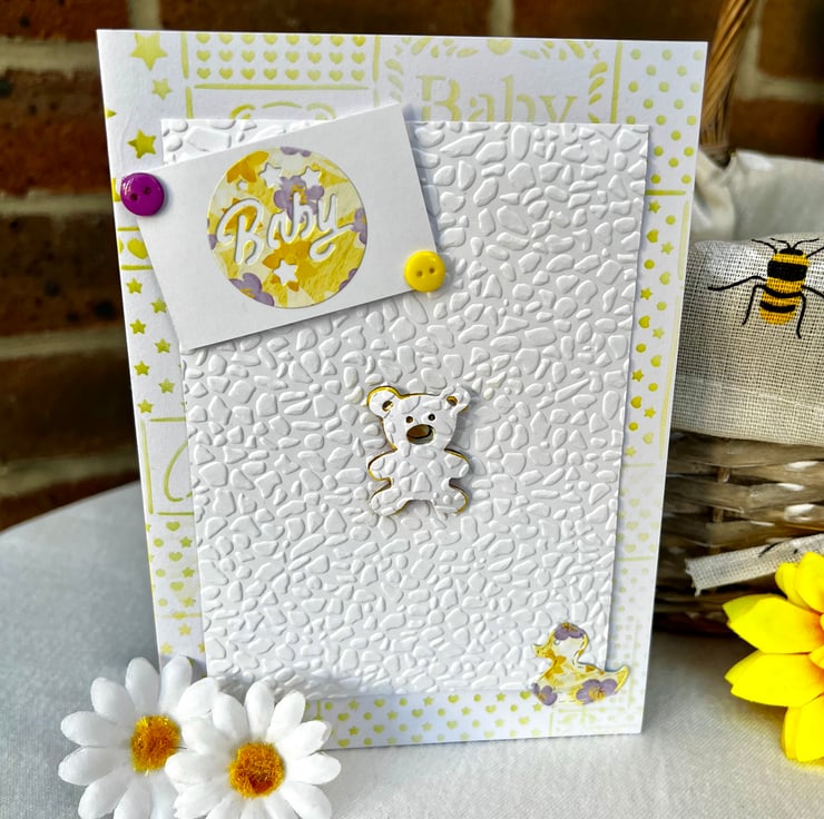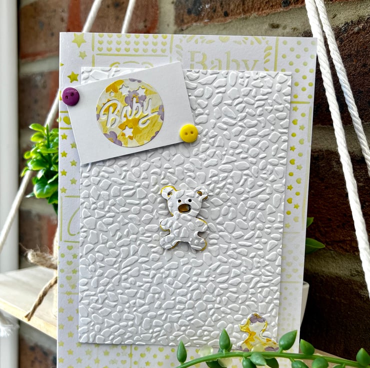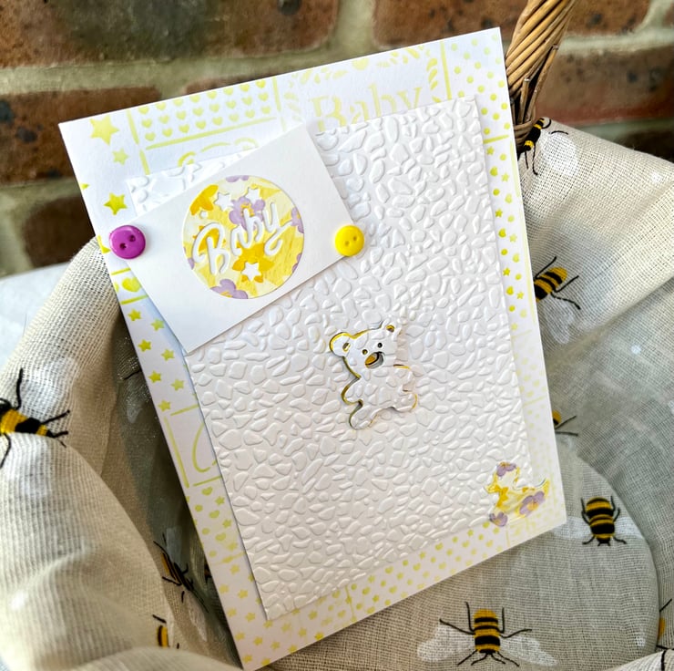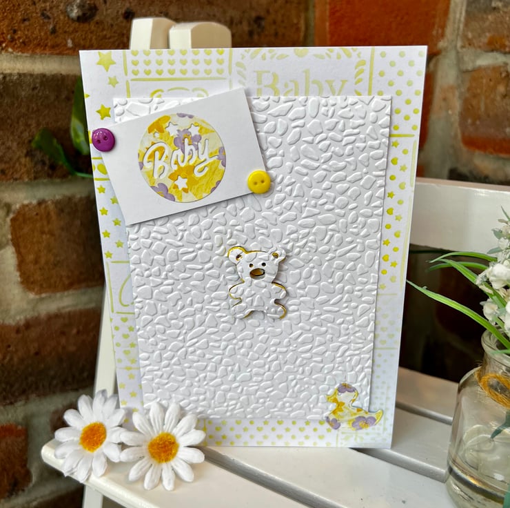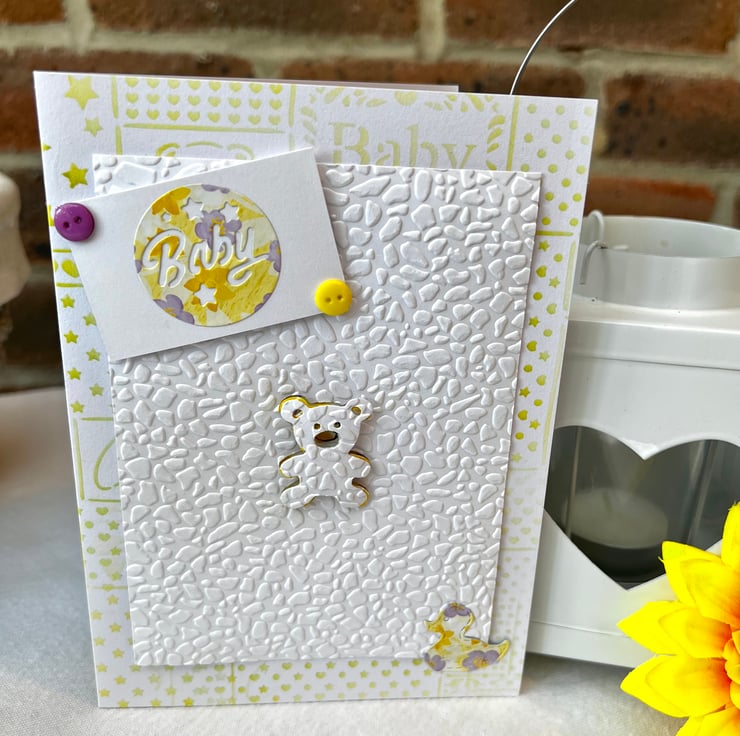 ‘New Baby’ Card. The front cover design is in shades of yellow with white. It features lots of embossed textures, buttons, stamped designs and die cut shapes including a teddy bear & duck.
