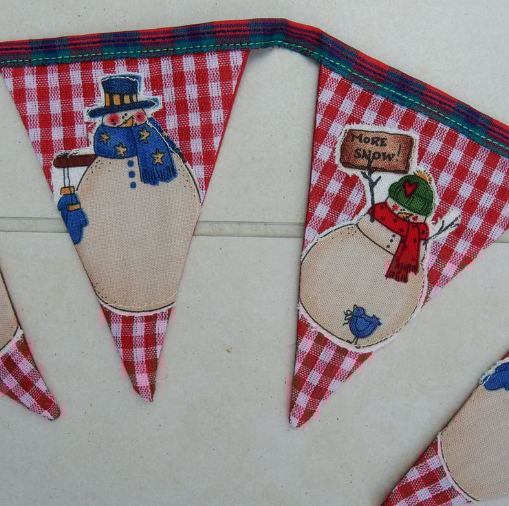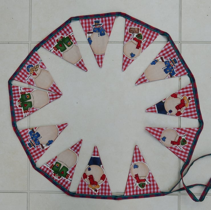 Twelve cute snowmen and ladies have been appliqued onto a gingham fabric for this cute Christmas mini bunting. The flags are backed in plain red fabrics, making them double sided which helps them to hang well. The tartan ribbon/tape measures 185 cm (72 inches), with the measurement from first to last flag being approx. 112cm (44 inches). This gives a generous length of bunting, with ties at each end for hanging. Each of the 12 flags is 11cm (4 inches) deep.