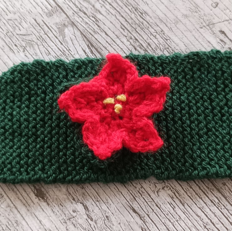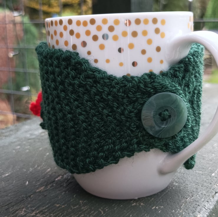 Knitted in garter stitch in 100% acrylic. Knitted in a forest green with a lovely hand knitted ponsietta sewn on. It fastens with a green button and fits standard size mugs and regular costa coffee cups.