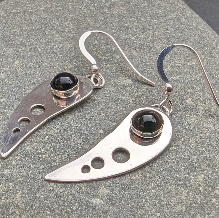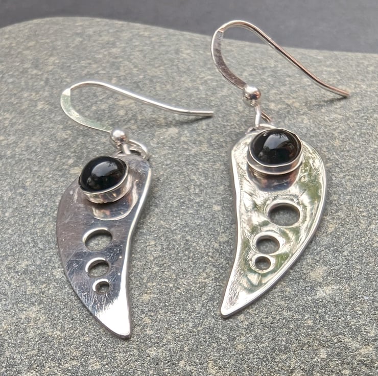 Really striking and unusual shaped earrings, sterling silver and black onyx. Perfect colour combination that will go with anything. Overall measurements approximately .5" wide x 1.25" long. Sterling Silver Hooks. Hallmarked at Edinburgh Assay Office.