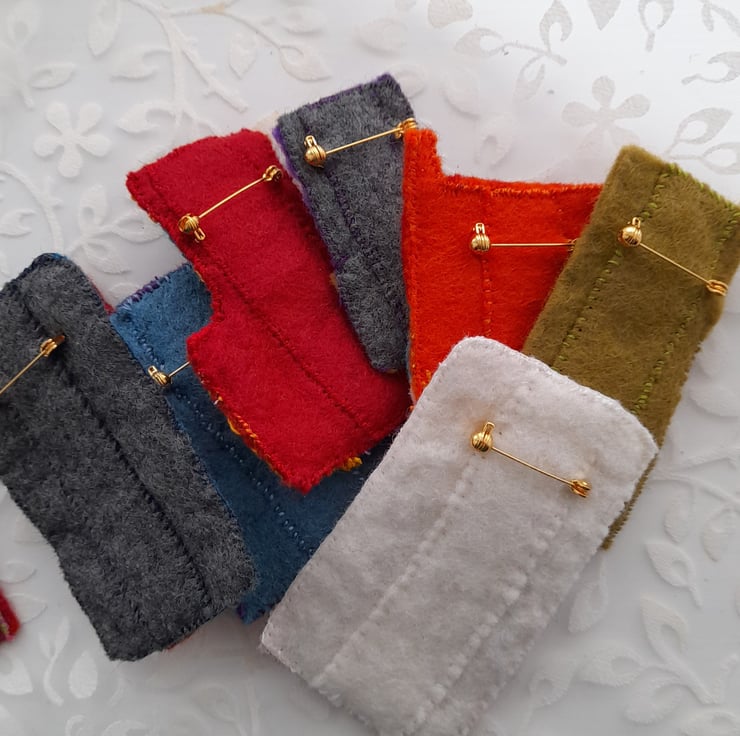 These brooches are made by wet felting, hand stitching, and applique all combined. It take several hours to make each one and I use vintage textiles and recycle textiles when using applique. The brooch backs are sewn in and are made from either silver plate or gold plate. The brooches are backed with machine made felt to give more strength.