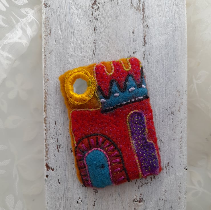 These brooches are made by wet felting, hand stitching, and applique all combined. It take several hours to make each one and I use vintage textiles and recycle textiles when using applique. The brooch backs are sewn in and are made from either silver plate or gold plate. The brooches are backed with machine made felt to give more strength.