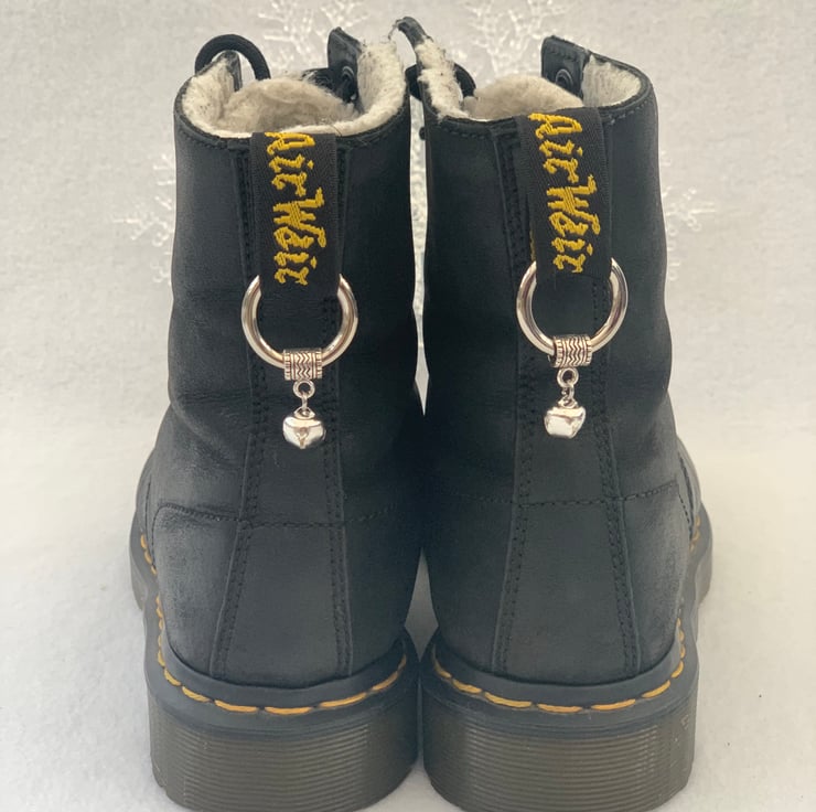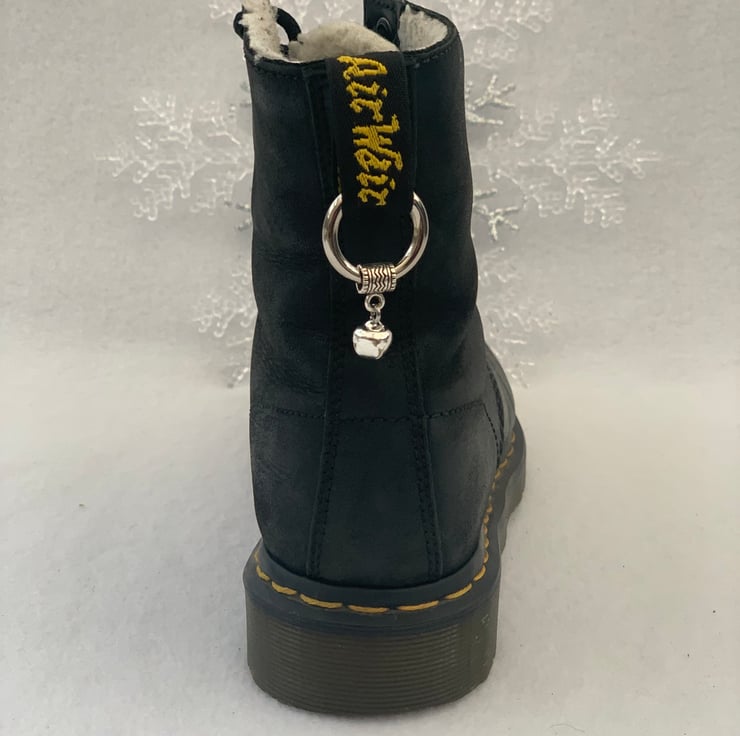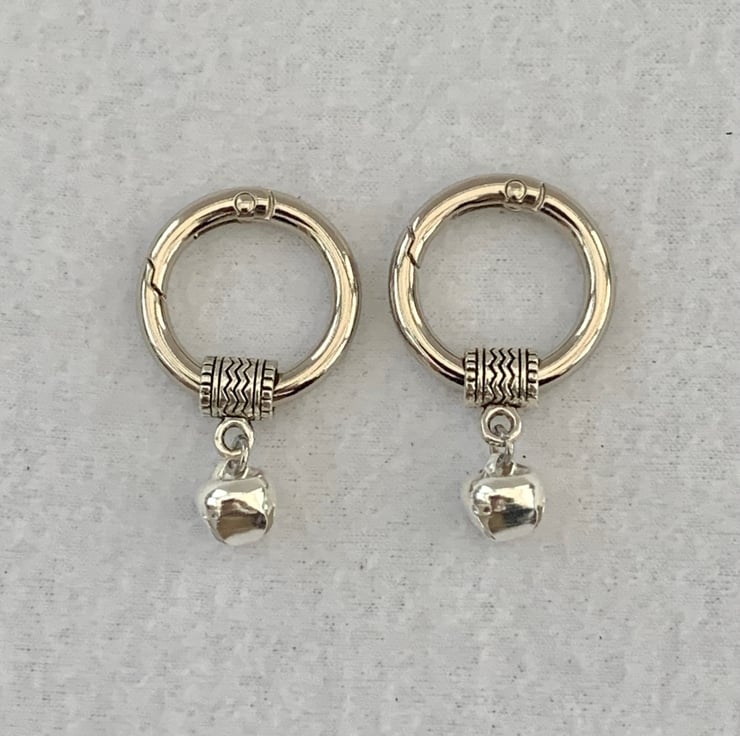 Iron jingle bell pendant in silver tone measuring 10mm fitted with a stainless steel jump ring (for strength and longevity) onto a decorative alloy pendant bail and hung from a platinum coloured zinc alloy spring O Rings measuring approximately 27mm outer diameter, 4mm thick with a 20mm inner diameter.