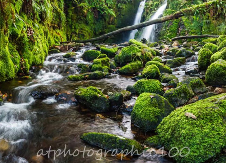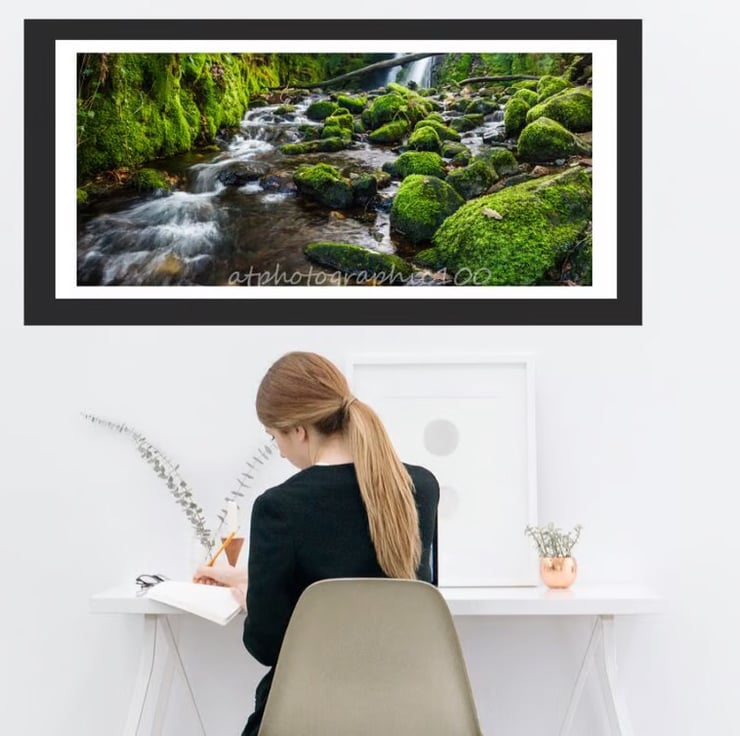 Panoramic photo print of the twin waterfalls of Venford Brook as it flows down to the West Dart River on Dartmoor. It was taken after a couple of days of rain and shows off the twin cascade that this brook is noted for. The drop is approximately 10 feet and the small gorge it empties into is very narrow and can be a bit tricky to access especially after heavy rain.