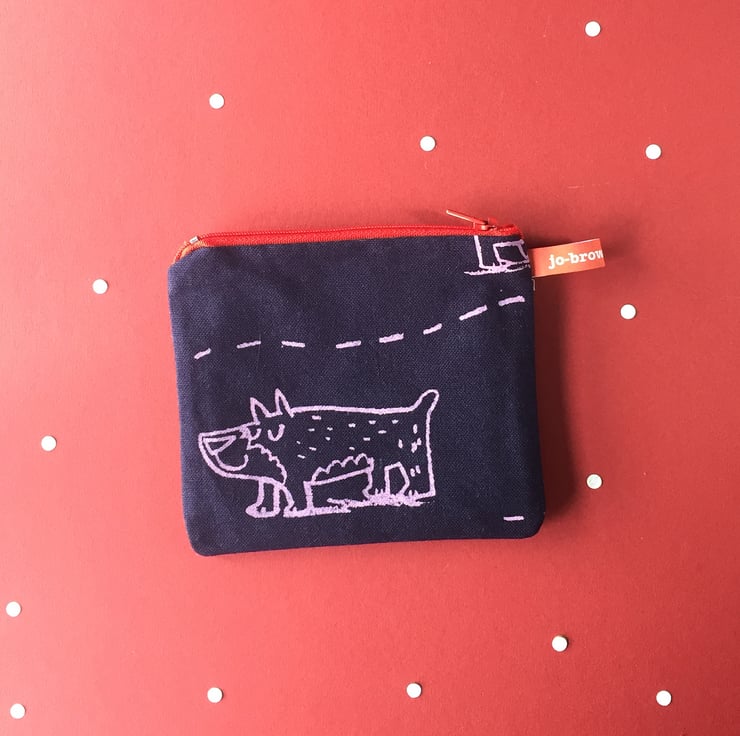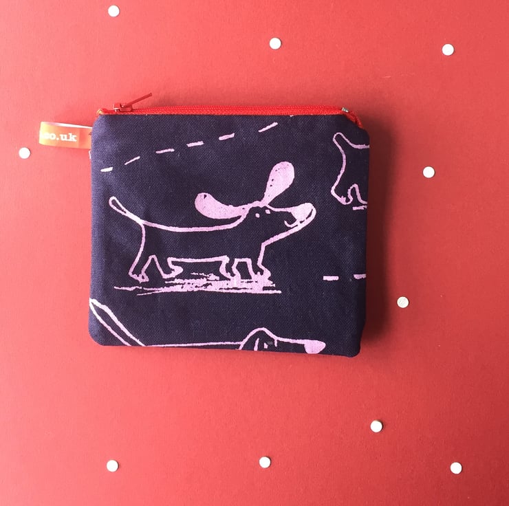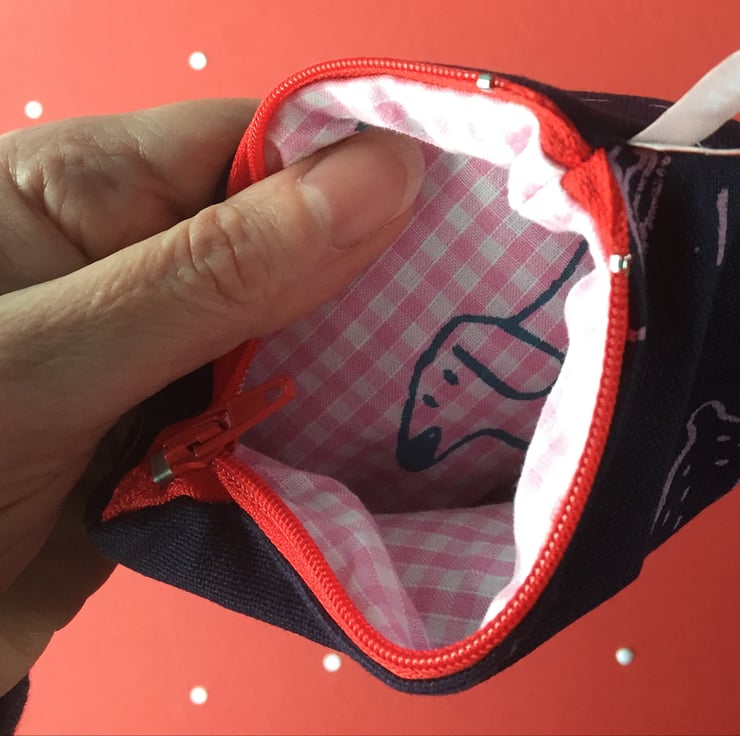 Cute cotton zip purse, with pink screen printed dog pattern, on dark blue, different pattern each side. With pink and white gingham cotton lining with ONE dark blue dog inside.