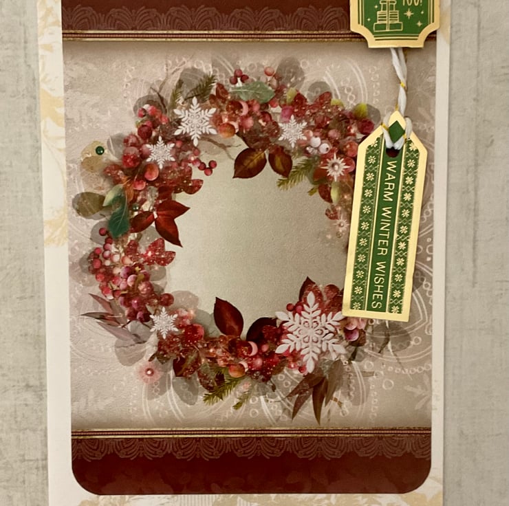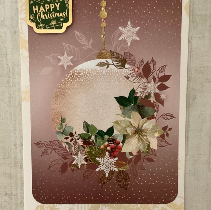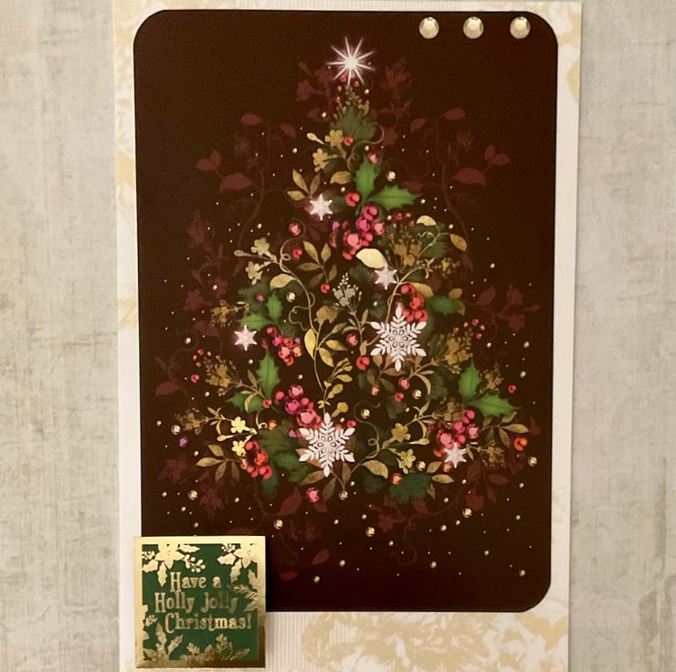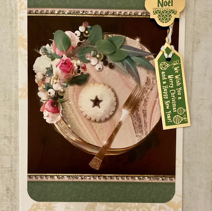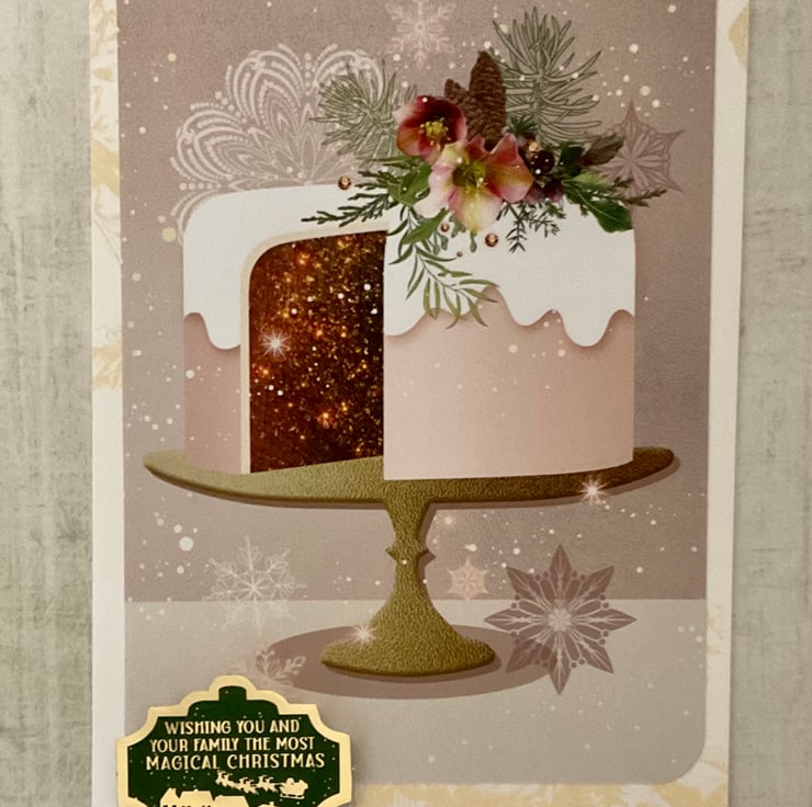 These cards have a white card base that has been printed with a gold floral print. The card has been layered with printed paper featuring Christmas cake, mince pie, a bauble, a Christmas tree or a cake with a gloss finish. Each card has a different greeting such as Wishing You and Your Family the Most Magical Christmas.