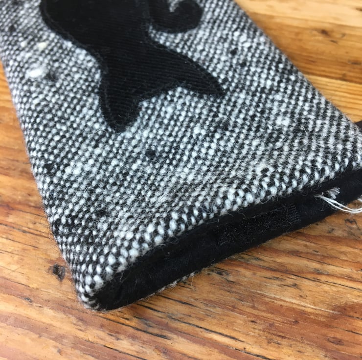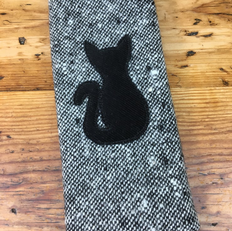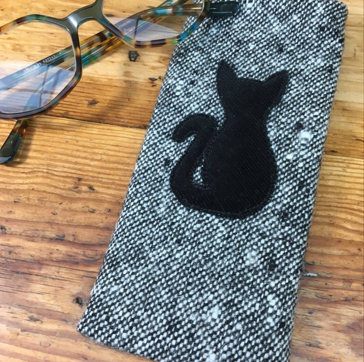 Protect your eyewear in style with this high quality tweed wool glasses case featuring an adorable black cat design. Stiffened with vilene and lined with soft black felt with a Velcro closure to keep your glasses safe and scratch-free. Perfect for reading glasses or sunglasses. A thoughtful present or treat for yourself.