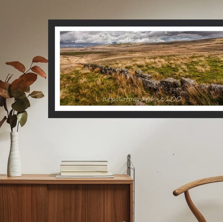 This stunning panoramic photography print was taken looking out over Foxmire on Dartmoor. It is said that this landscape was the inspiration for the book The Hound Of The Baskervilles. It looks out across one of the more bleak (but beautiful) parts of Dartmoor. Although not far from Princetown there is a feeling of isolation here.