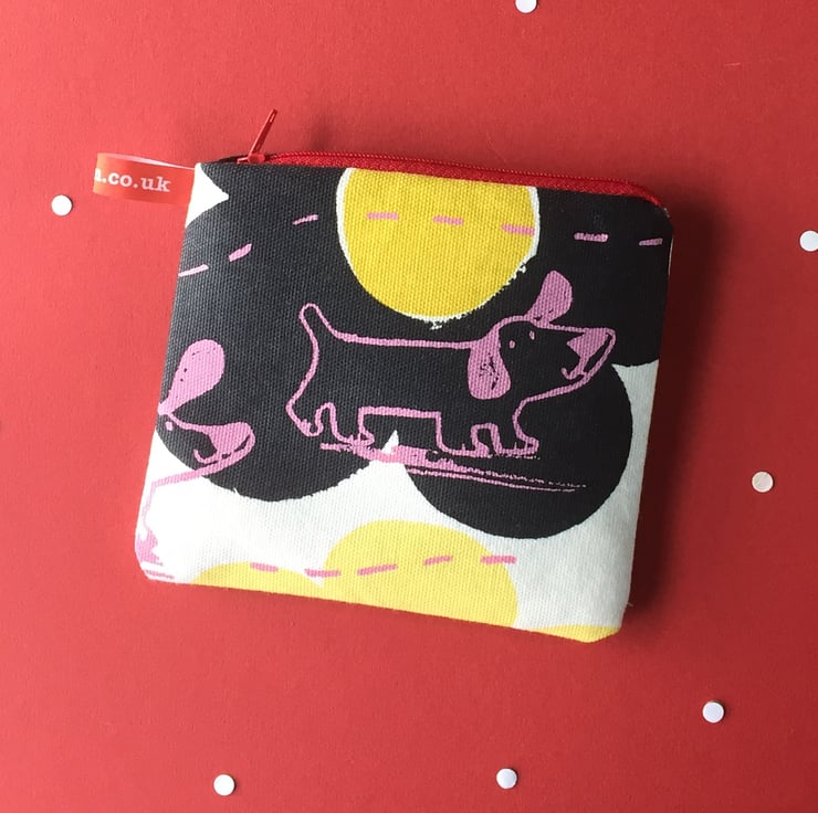 Cute cotton zip purse, found floral fabric overprinted with my pink and deep turquoise screen print dog pattern, different design each side.