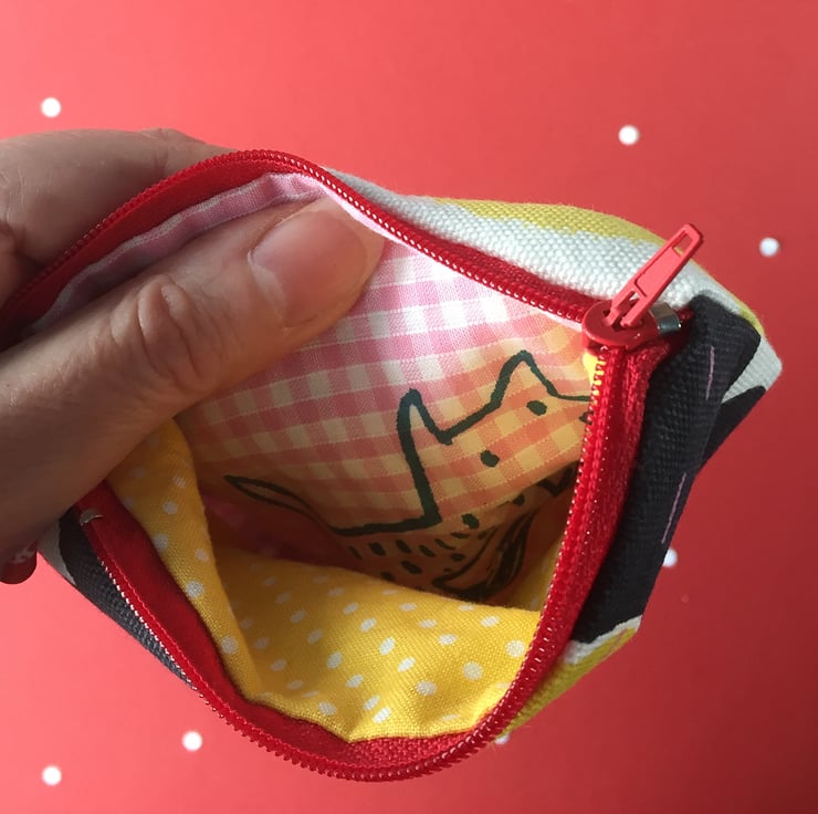 Size approx 14cm wide by 12 cm deep, red contrast zip.