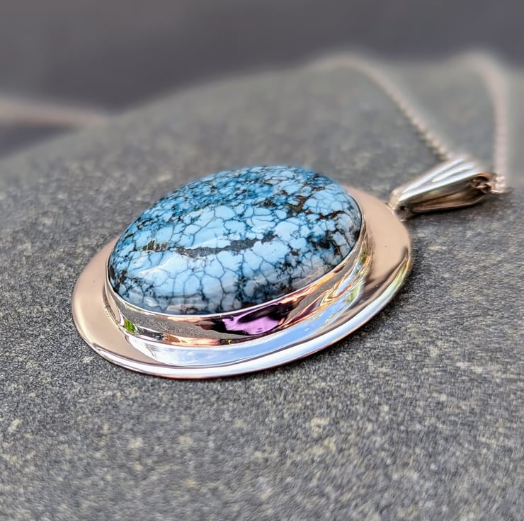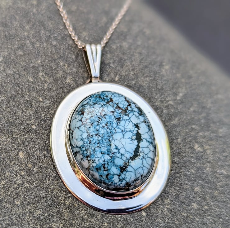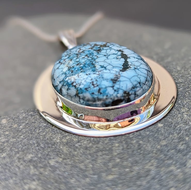 A beautiful Turquoise set in sterling silver. The back plate slightly larger than the gem provides a frame to set the turquoise gemstone off beautifully. Overall measurements approximately 1.2" wide x 1.3" long Hallmarked at Edinburgh Assay Office.