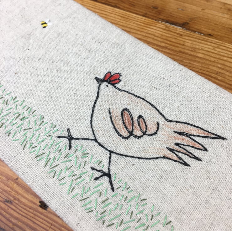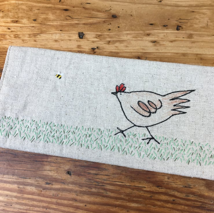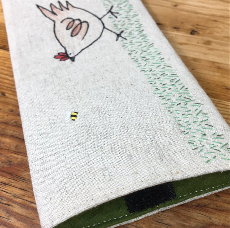 A unique and fun glasses case adorned with a playful scene of a chicken chasing a bee. Meticulously crafted with both machine and hand embroidery, this glasses case is both charming and practical. There is lovely detail in the hand embroidered grass.