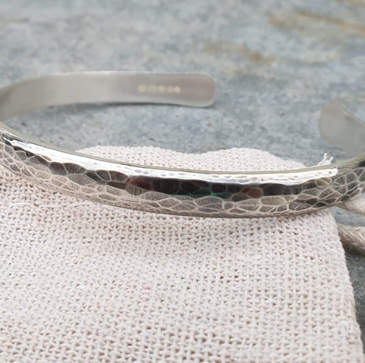 This open bangle has been forged from D shaped silver wire. It measures 6mm wide and has a hammered texture which has been oxidised. The bangle has an inside diameter of 60mm with a gap of approx 25mm