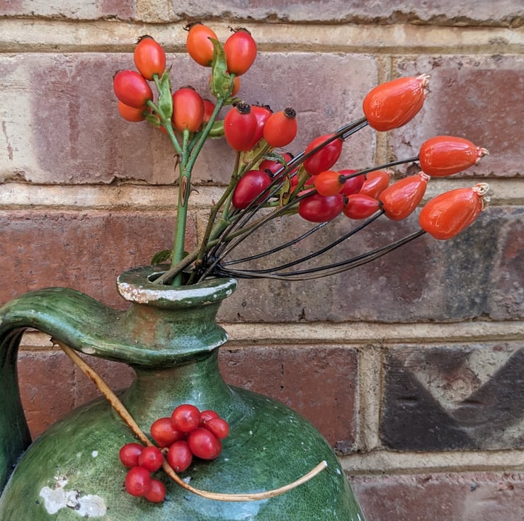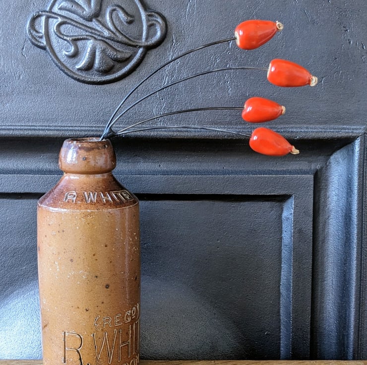 Ceramic rosehip stems (ceramic flowers), consisting of four rosehip berries on two wire stems, ideal for flower arranging. Sculpted by me in stoneware clay, fired, then glazed in Sunset Orange (a deep orange-red) and re-fired. The rosehips look lovely in fresh, dried or artificial flower arrangements - giving a beautiful pop of colour - and can be combined with my stained glass flowers.