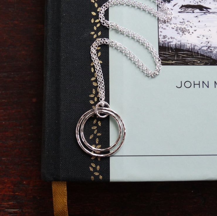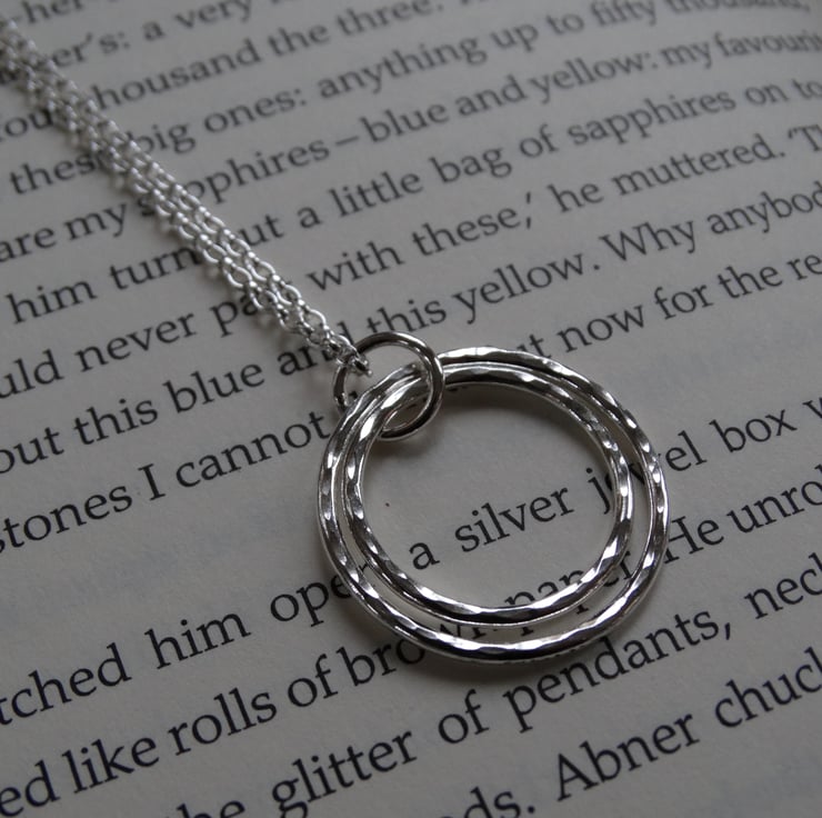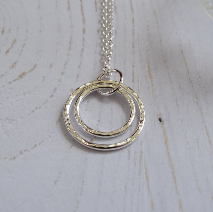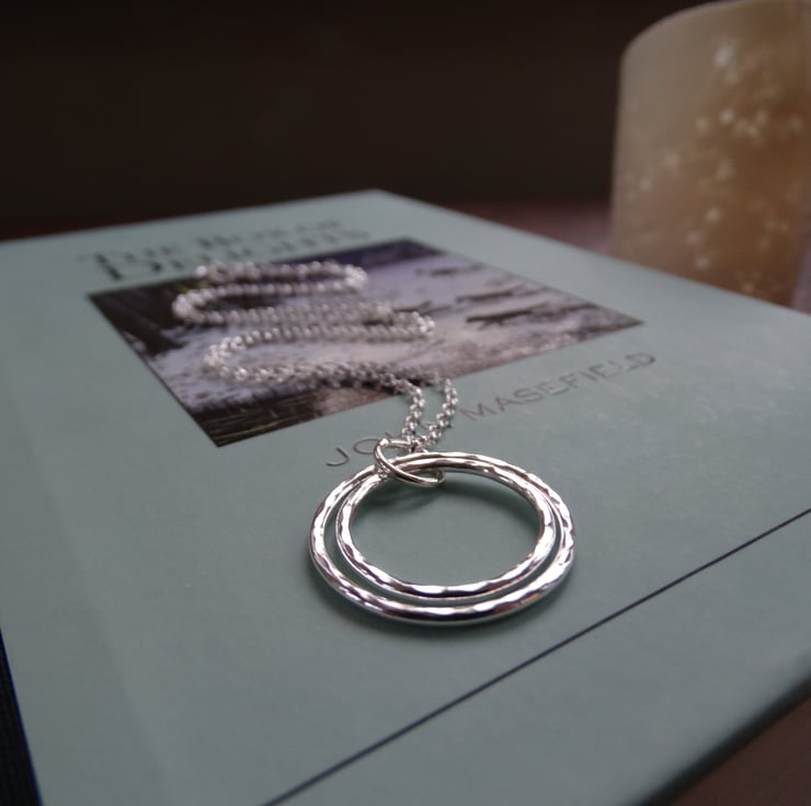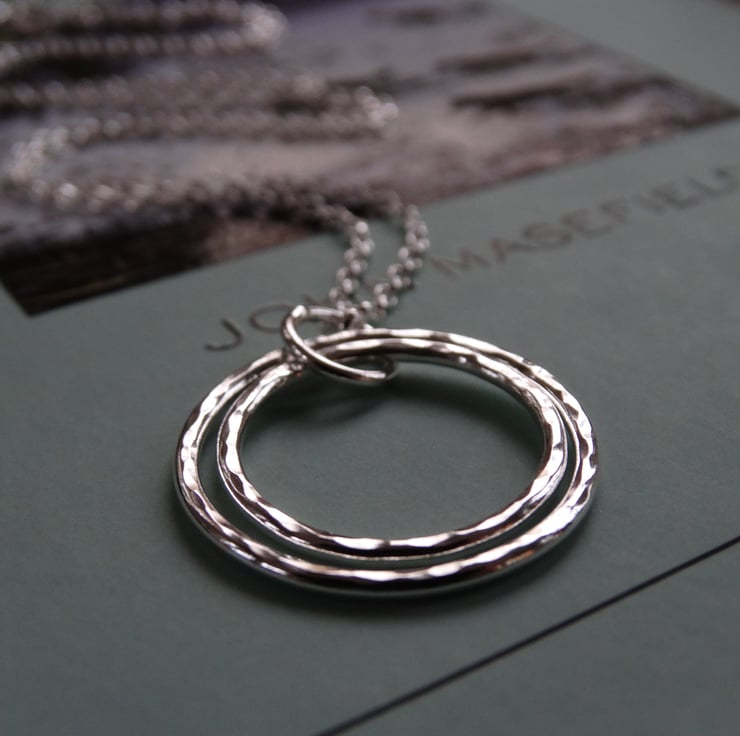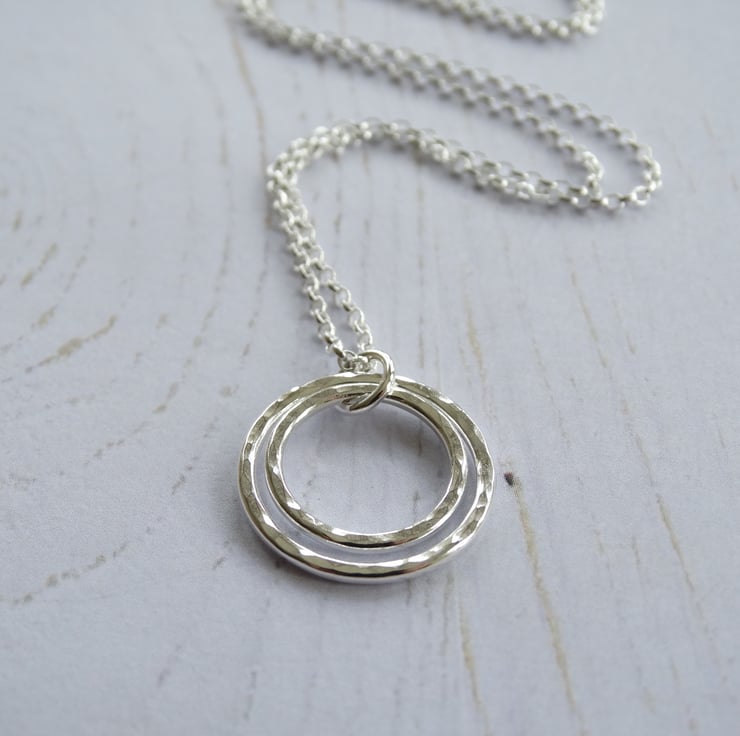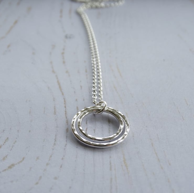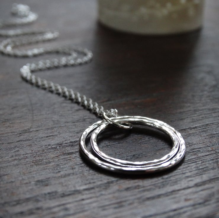A pretty handmade sterling silver hoop pendant made from recycled sterling silver. Really simple, but very stylish! The silver hoops have been lightly hammered so that the silver gently catches the light as they move.