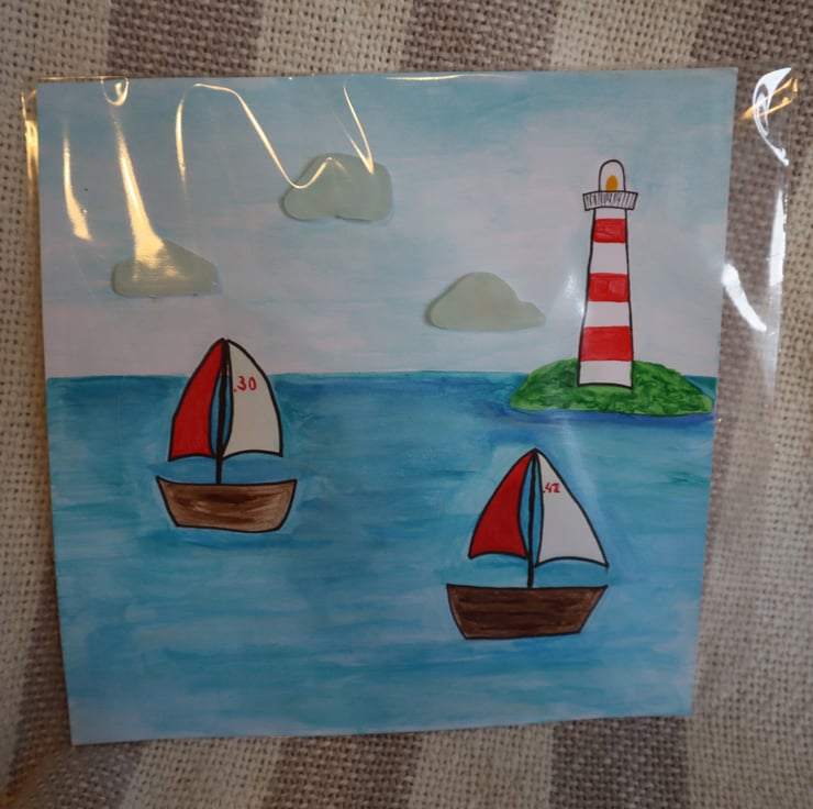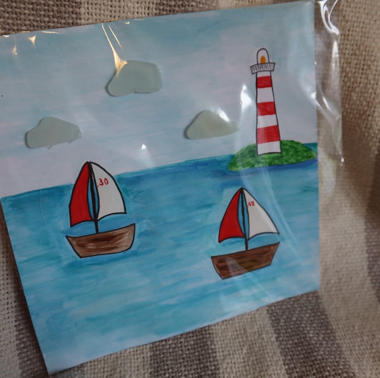 A 7x7 painting of a harbour with boats and lighthouse.