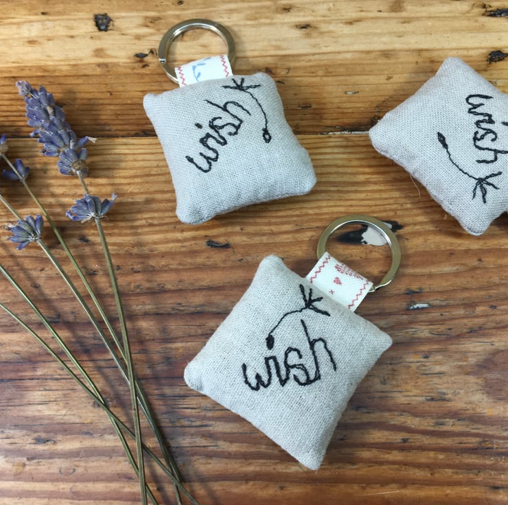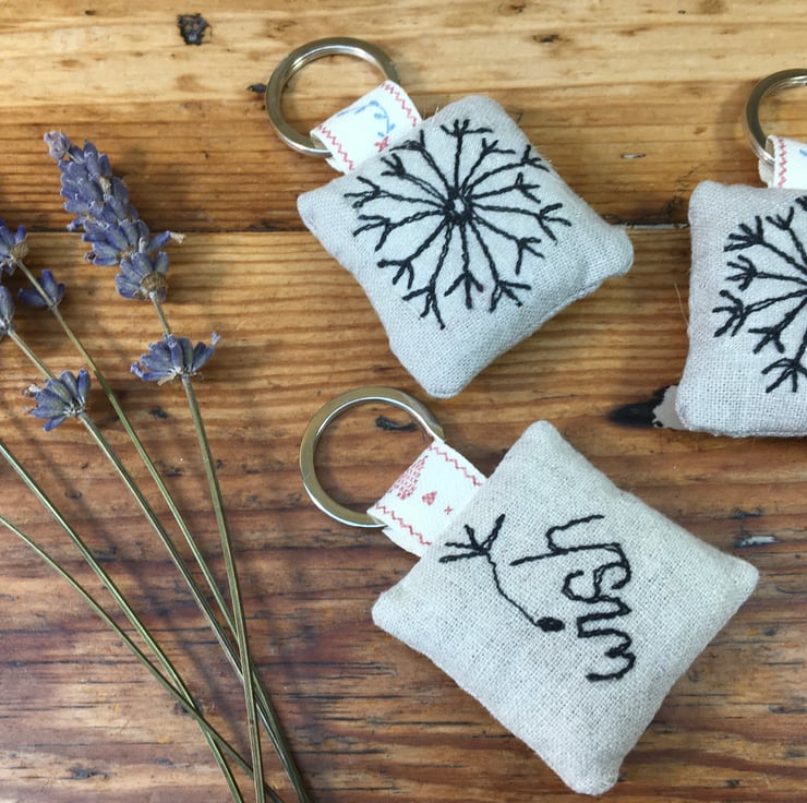 Beautifully crafted to keep your keys tidy with a dandelion seed head embroidered on one side and the ‘Wish' on the other with a dandelion seed gently floating away on the breeze.
