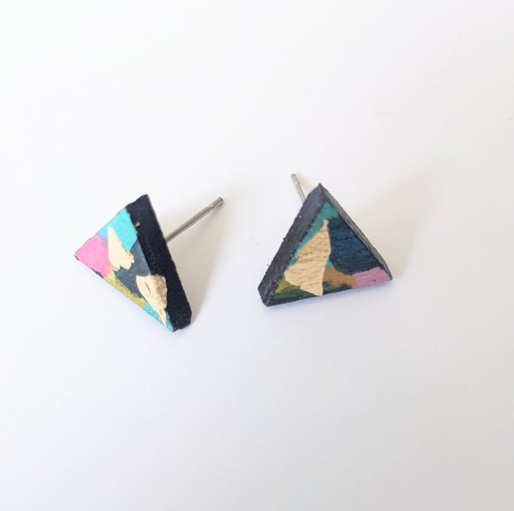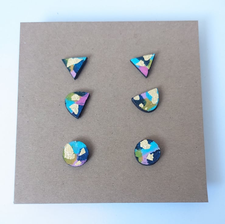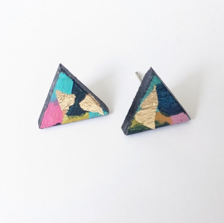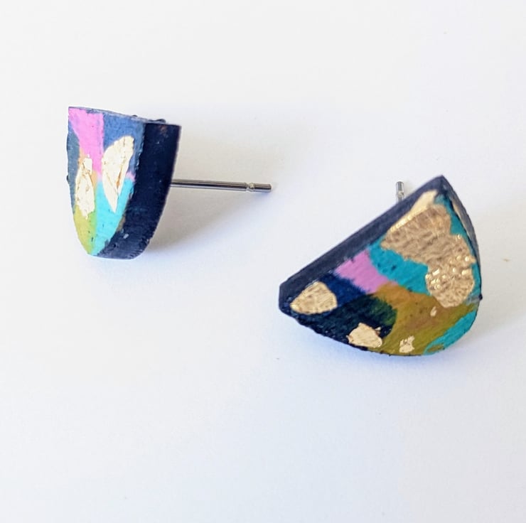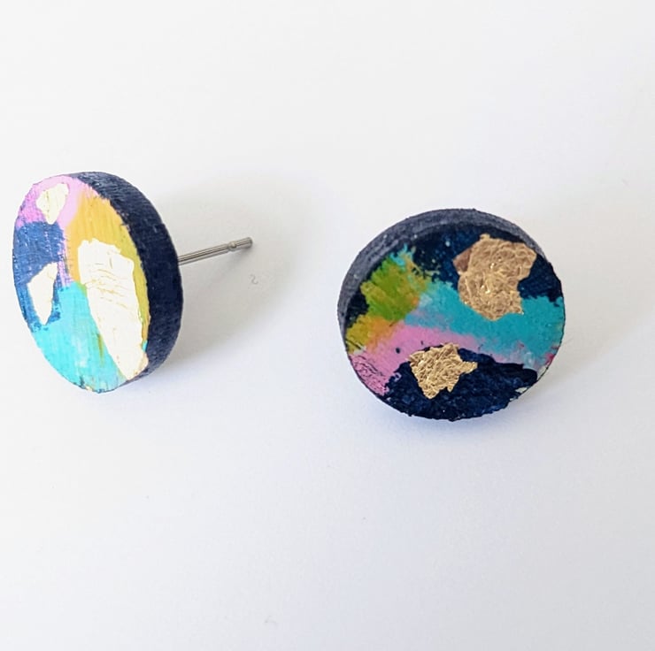 Super lightweight and comfortable to wear, these are created using a laser cutter on 3mm eco-friendly birch plywood. They are then individually sanded and carefully painted using low toxic acrylic paint, finished with gold leaf detail and low toxic varnish.