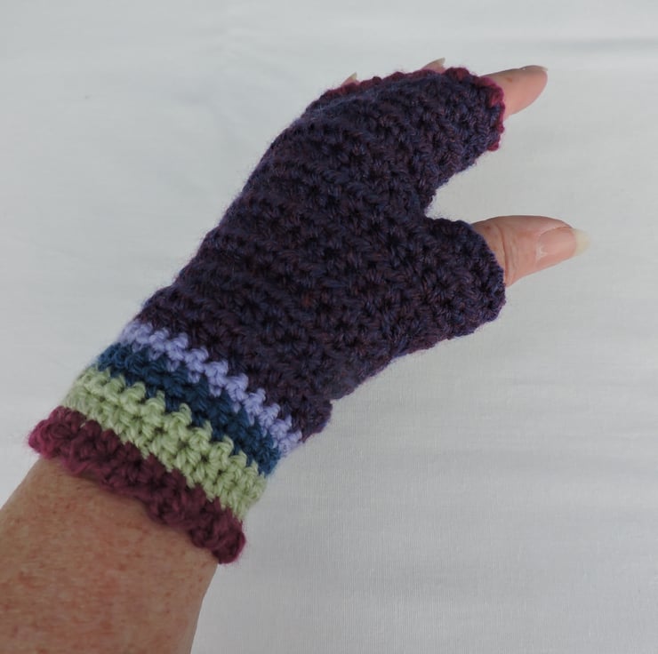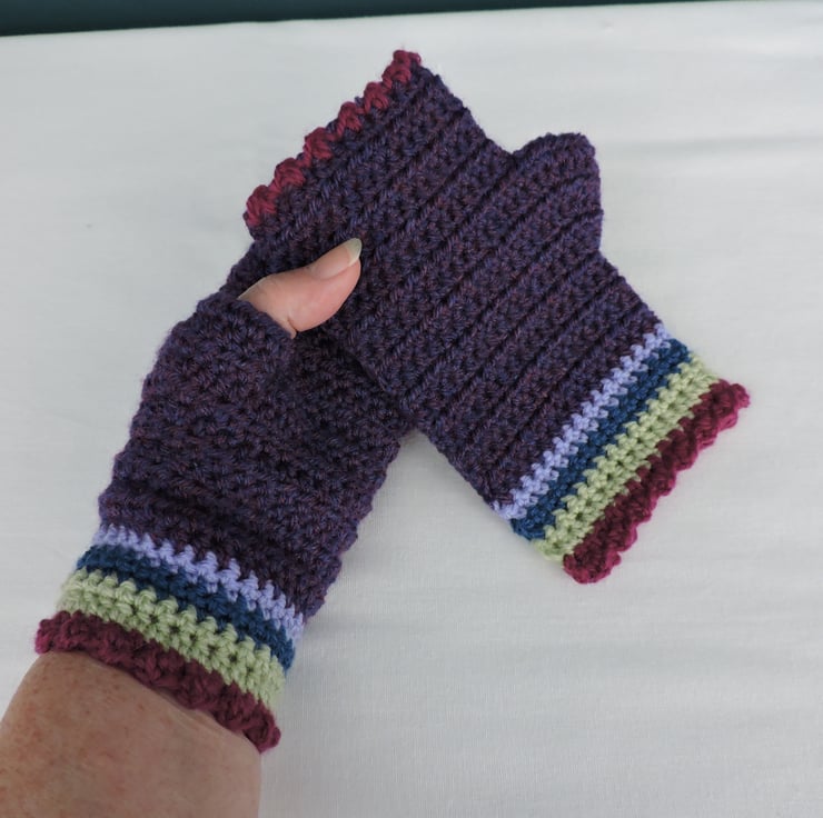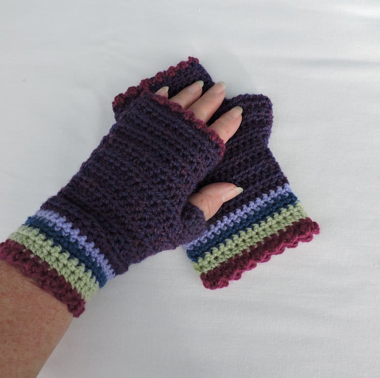 Sale Adults fingerless mitts crocheted in double knit acrylic yarns. The main body of the mitts is a gorgeous rich blackcurrant colour with the cuff in lilac, teal, lime and raspberry pink. There is a picot edge top and bottom in the raspberry pink. Cosy winter warmers, ideal for dog walkers and those who need to have their fingers free.