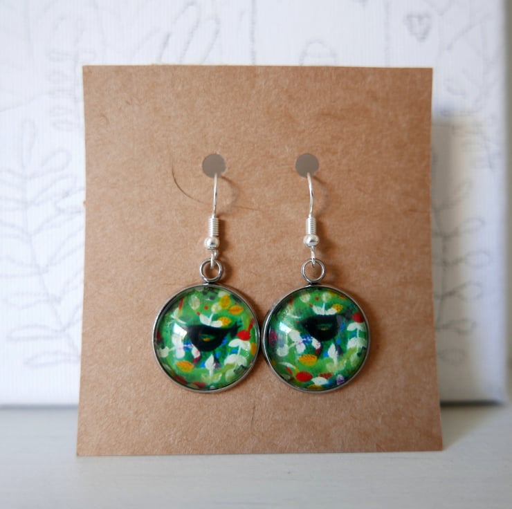 These blackbird dangle earrings are created using mini prints after one of my paintings and a stainless steel bezel and glass cabochon to fix the image in the setting. The hook is nickel-free metal. (I have sensitive ears and I always make a pair of earrings for myself for testing).