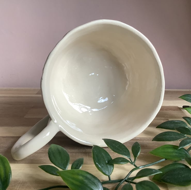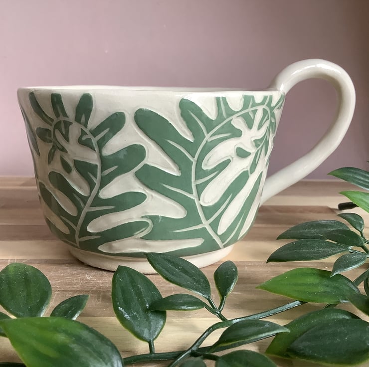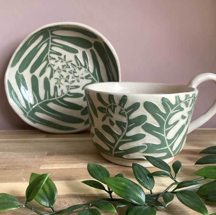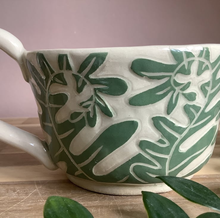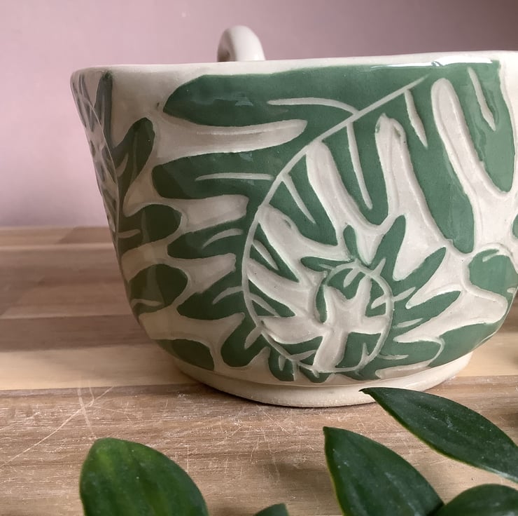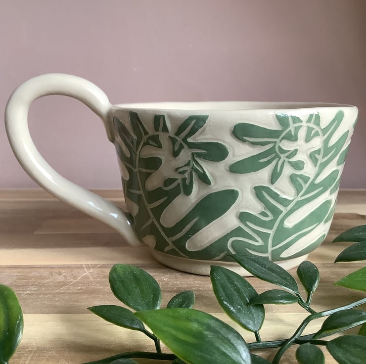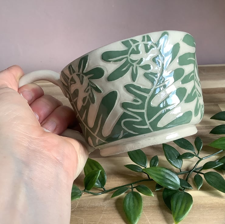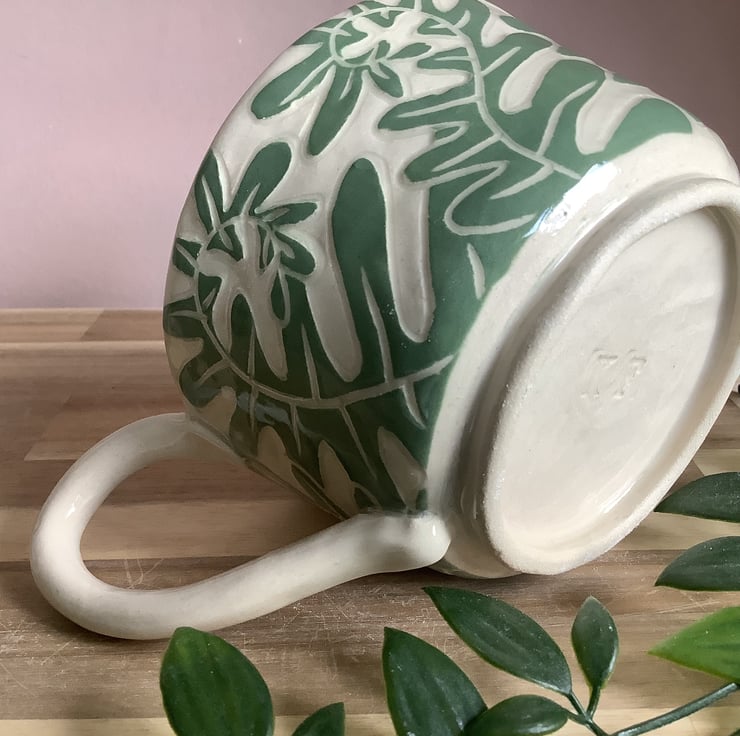 This lovely sgraffito mug with gorgeous unfurling fern leaf fronds, glazed in beautiful calming green, will add a freshness of nature to your morning coffee break.