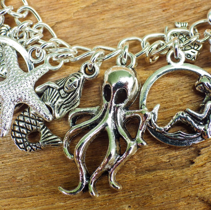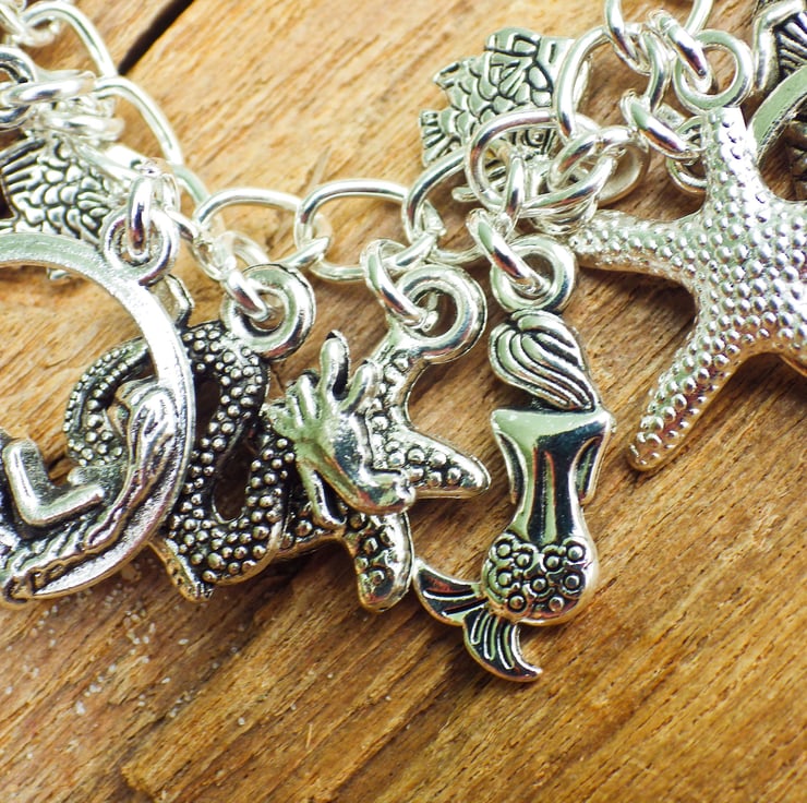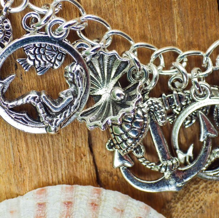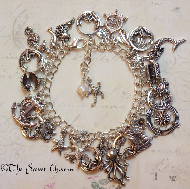 This pretty charm bracelet has been handmade to capture the beauty of the mermaid sea sirens and the creatures that inhabit their watery world.