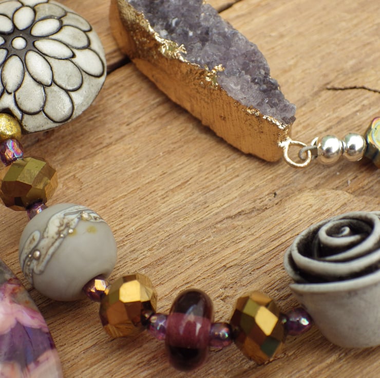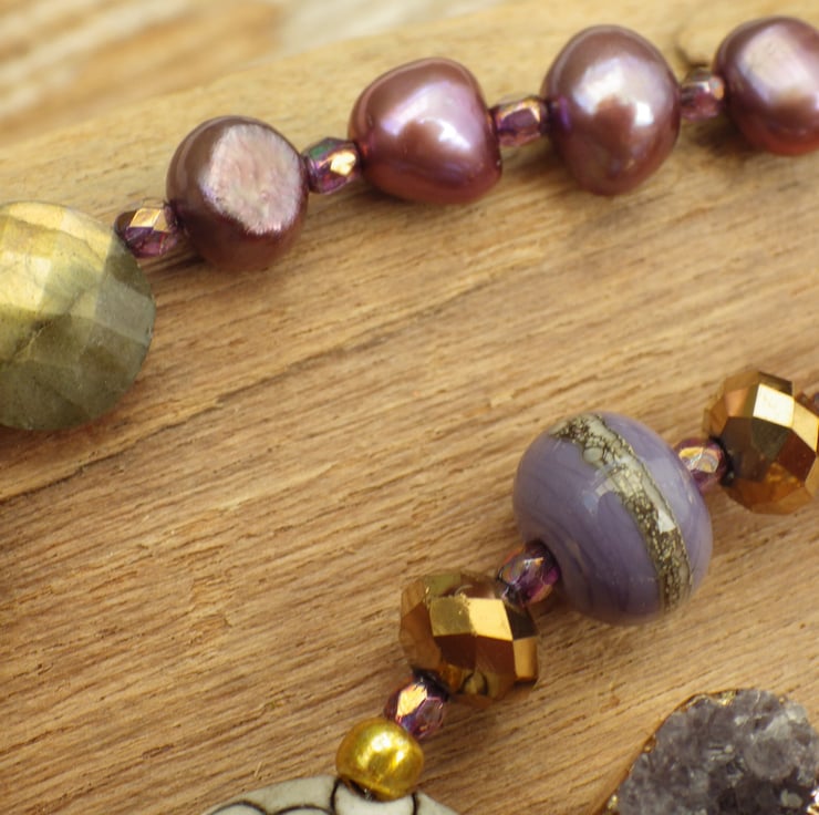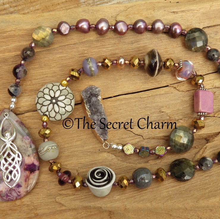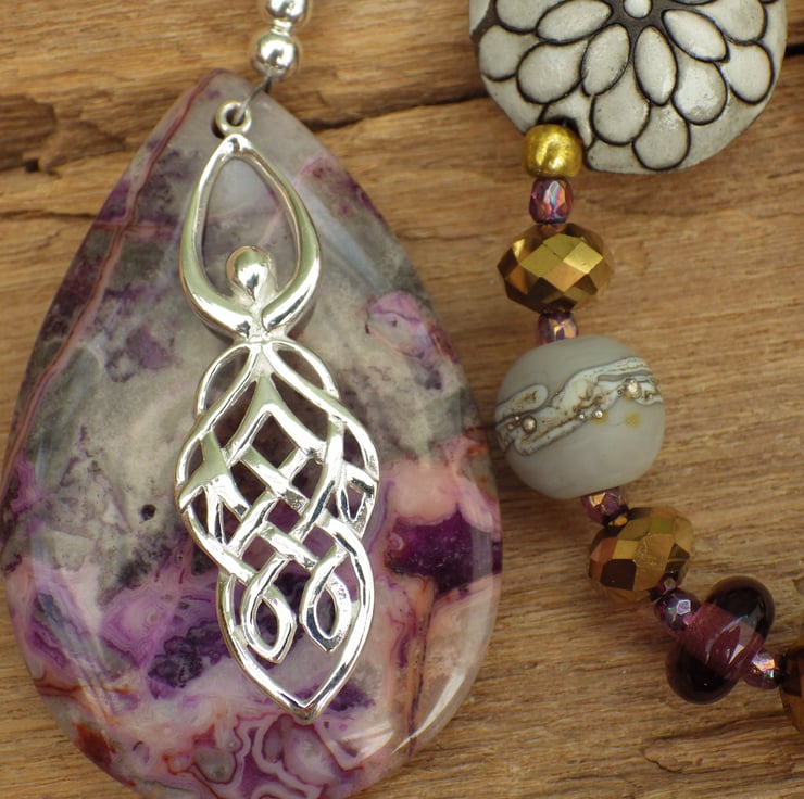 A sterling silver Celtic Goddess on a crazy agate pendant (52x35mm) hangs from one end of the beads, with a gold plated druzy quartz geode (34x13mm) hanging from the other.