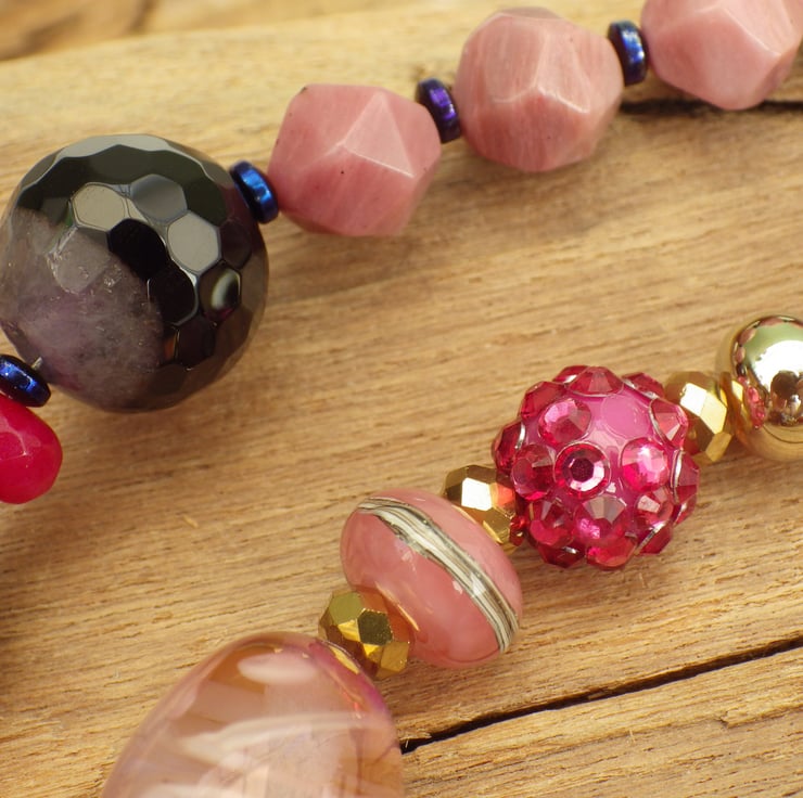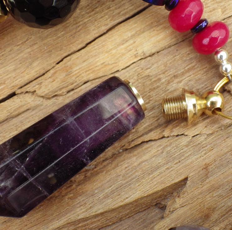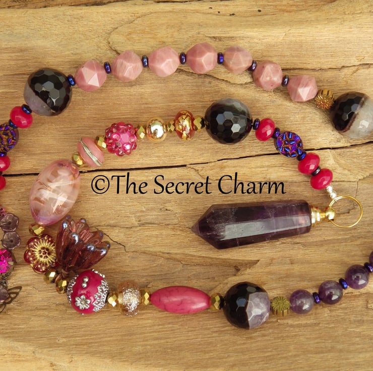 Handmade using gemstones, sterling silver, artisan lampwork glass, art beads, gold plated crystals, an Indonesian clay bead, an artisan beaded ring and a fluorite gemstone bottle. The bottle has a screw lid so that spell potions, perfumes or incense can be added by the owner.