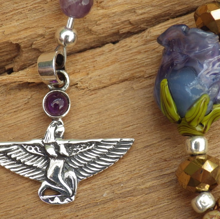 A 925 sterling silver Goddess Isis (23mmx27mm) hangs from one end of the beads, with a beautiful iridescent artisan lampwork glass wing (40mmx28mm) from the other.