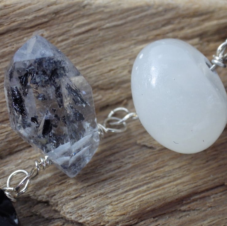High quality gemstones include: Herkimer diamond, rutilated quartz, citrine, agate, aquamarine and moonstone.