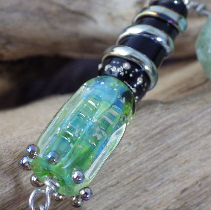 These special one of a kind prayer beads are 13" (34cm) long and have been handmade using a variety of semi precious gemstones, artisan lampwork glass, sterling silver, artisan ceramics, fine silver and a large crystal.