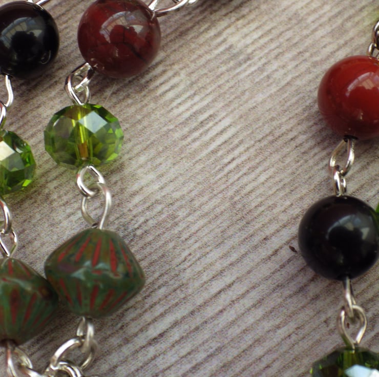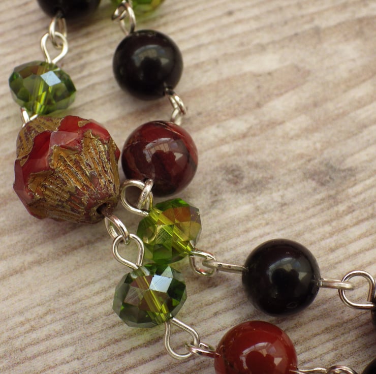 This necklace has been handmade using 8mm poppy jasper gemstones, 8mm black obsidian gemstones, peridot glass crystals and a jasper pendant.